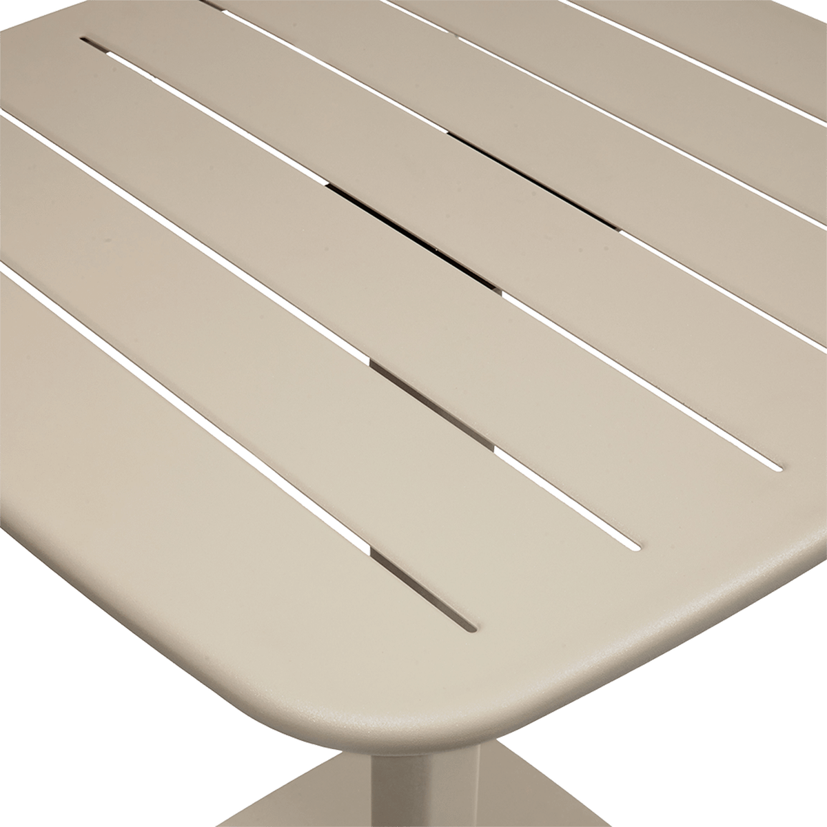 Het vierkante blad van 70x70 cm biedt voldoende plaats voor een drankje of een lichte maaltijd, terwijl het centrale onderstel voor extra stabiliteit zorgt. Dankzij het onderhoudsvriendelijke materiaal is de ROSSANO ideaal voor dagelijks buitengebruik – modern, praktisch en verfijnd.