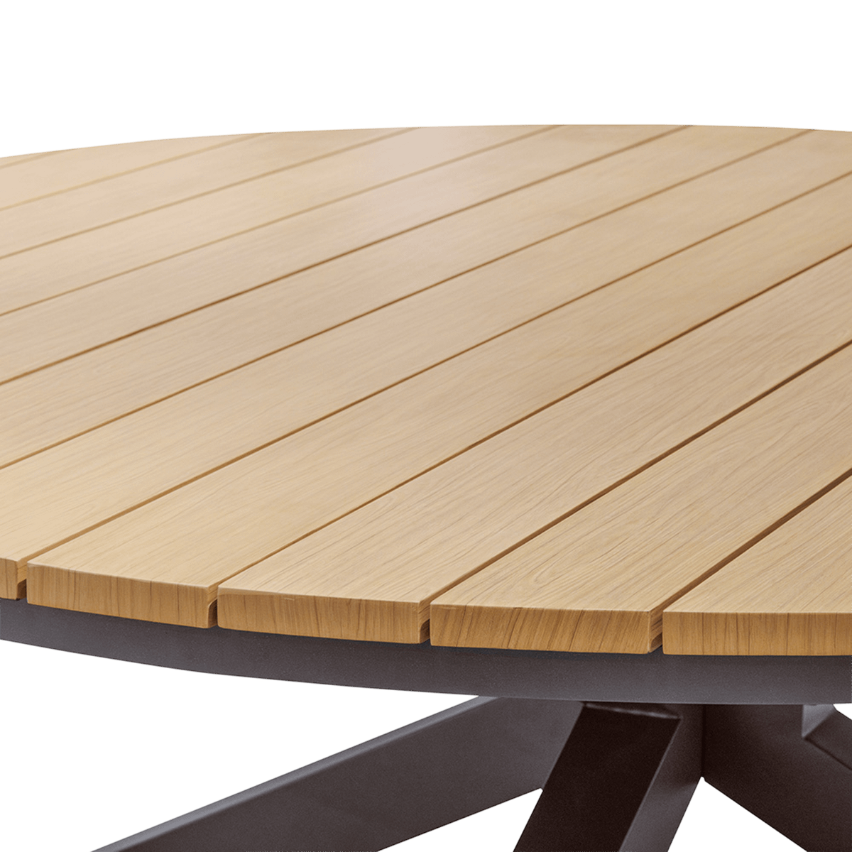 De LUCERA tuintafel combineert een natuurlijke uitstraling met een strak, eigentijds design. Het royale ronde tafelblad in houtlook biedt voldoende plaats voor gezellige diners, terwijl het grafietkleurige onderstel zorgt voor een moderne en stabiele basis.