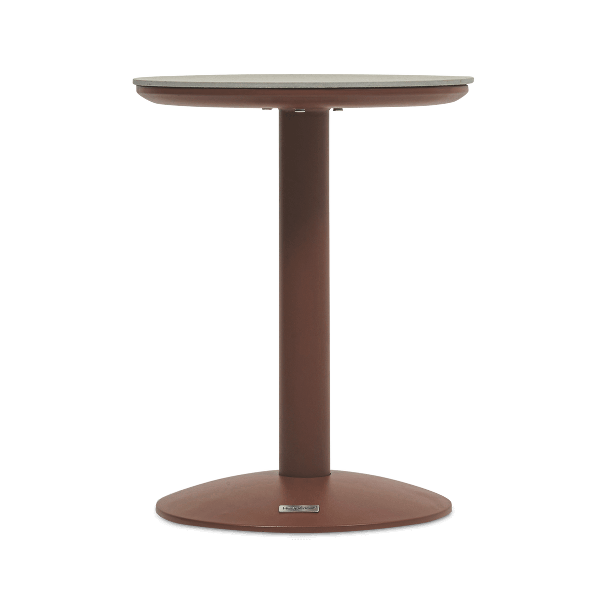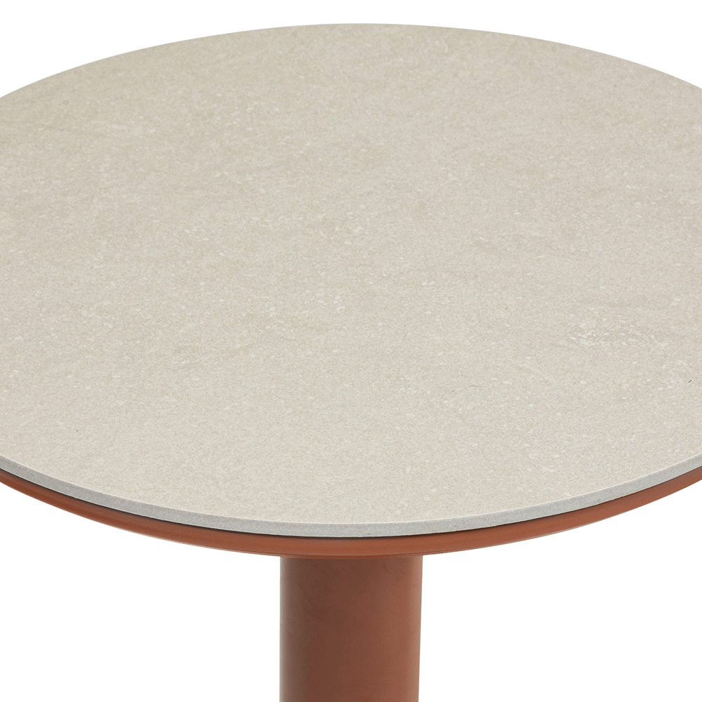 De SALUZZO Bijzettafel combineert een warme kleurtint met een verfijnd, modern silhouet. Het ronde tafelblad in lichte steenlook vormt een elegant contrast met de slanke centrale poot en de stevige, ronde voet in metaal.