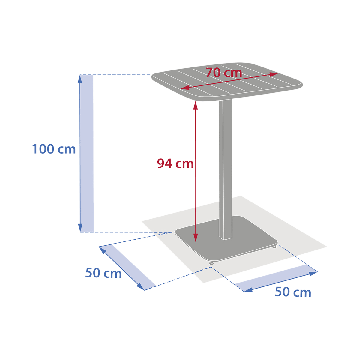 Bartafel Rossano straalt eenvoud en modern design uit, perfect voor een stijlvol terras of compacte buitenruimte. Dankzij het slanke onderstel en het vierkante tafelblad oogt deze bartafel licht en elegant, terwijl ze tegelijk stabiliteit en duurzaamheid biedt. Het formaat van 70x70 cm maakt ze ideaal voor gezellige momenten met twee tot vier personen, zonder veel plaats in te nemen.