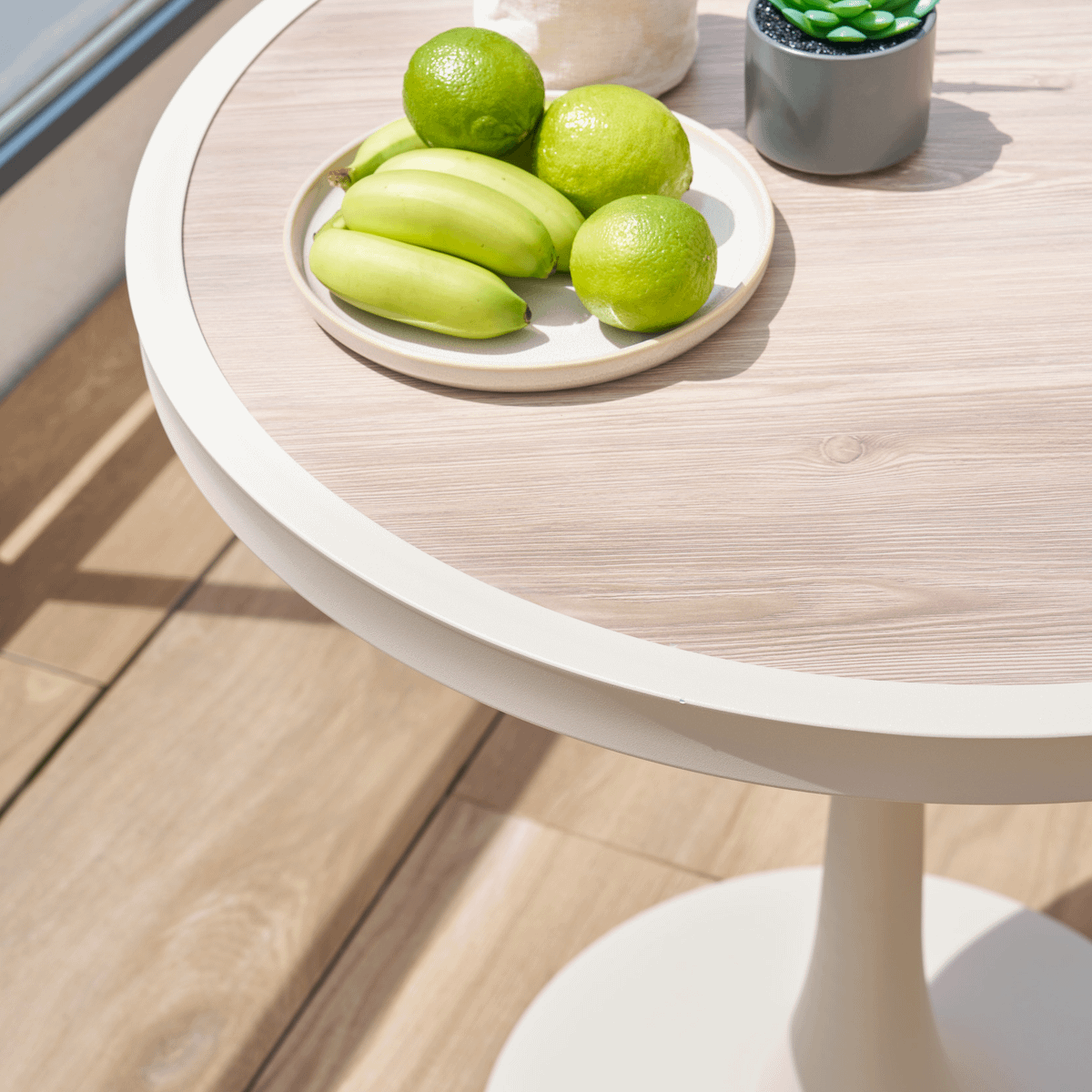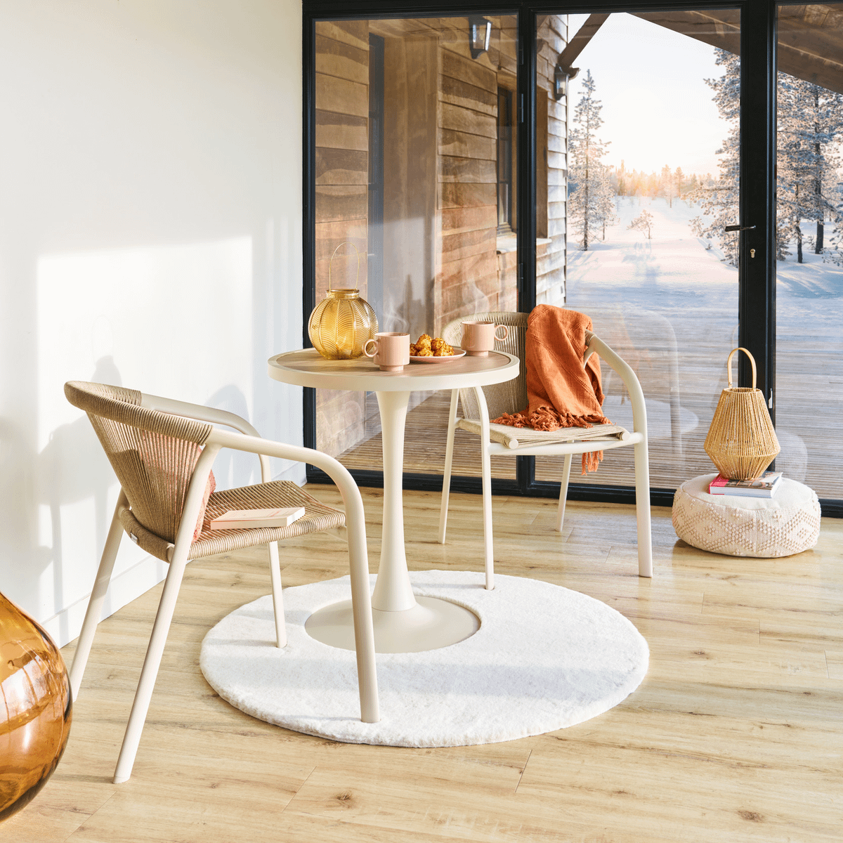 De zachte beige tint in combinatie met het subtiele blad geeft Lecco een lichte, warme uitstraling die zich eenvoudig laat combineren met verschillende stijlen. Ideaal voor een ontspannen ontbijt in de zon of een gezellige koffiepauze buiten.