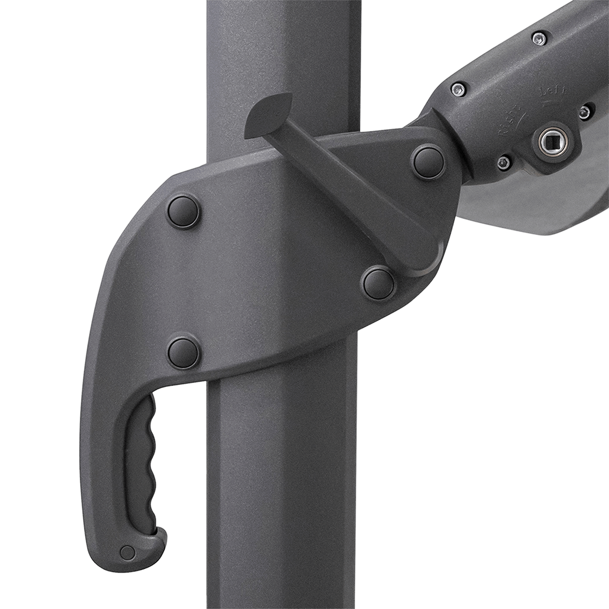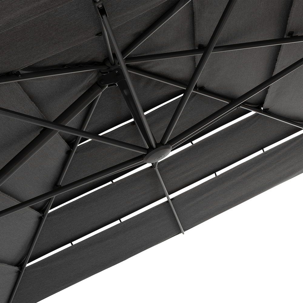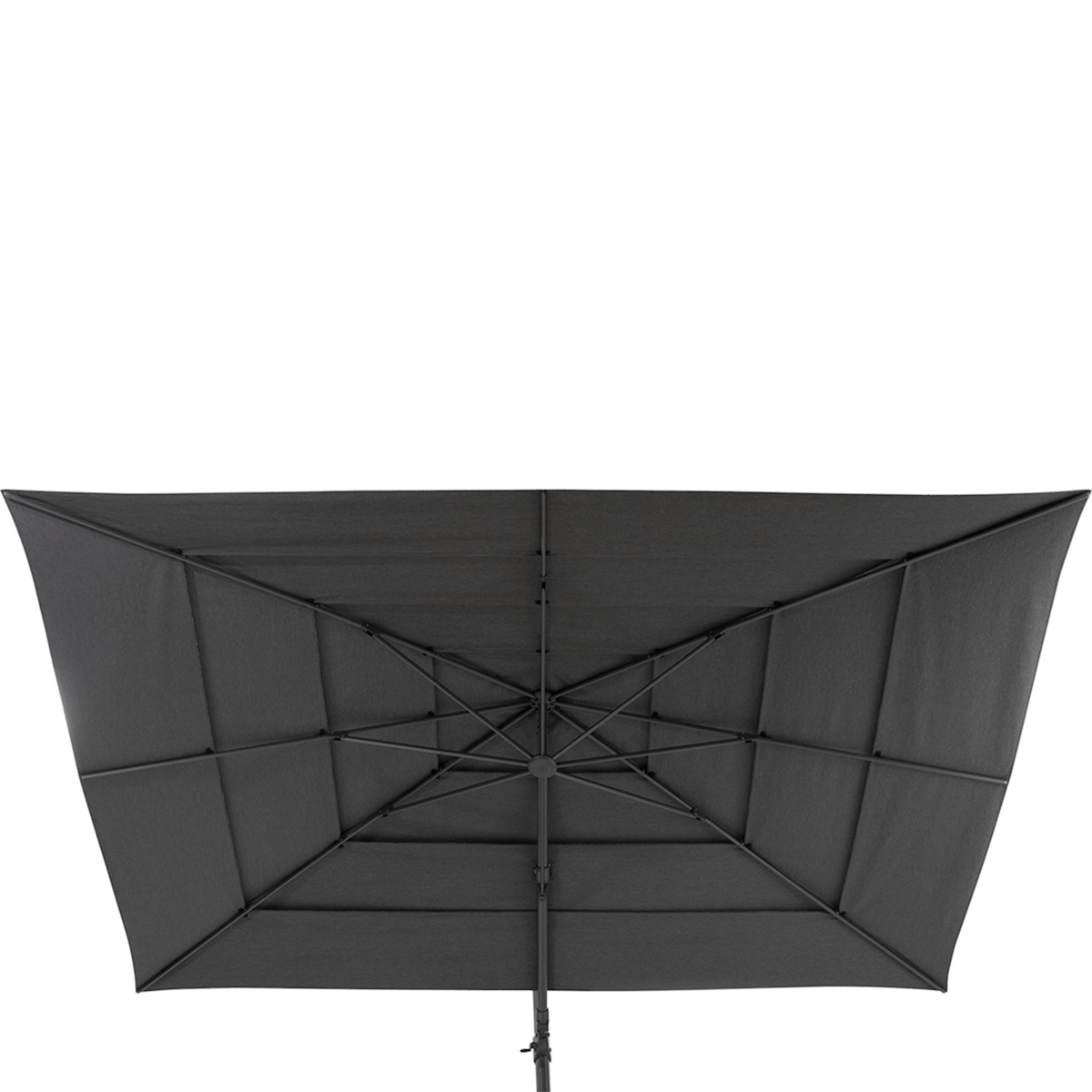 Dankzij de slimme multi opbouw biedt deze zweefparasol niet alleen een moderne uitstraling, maar ook extra ventilatie en minder windweerstand. Het ruime formaat maakt hem ideaal om een grote tuintafel comfortabel van schaduw te voorzien, terwijl het 360° draaibare en kantelbare systeem ervoor zorgt dat je de parasol eenvoudig aanpast aan de stand van de zon.