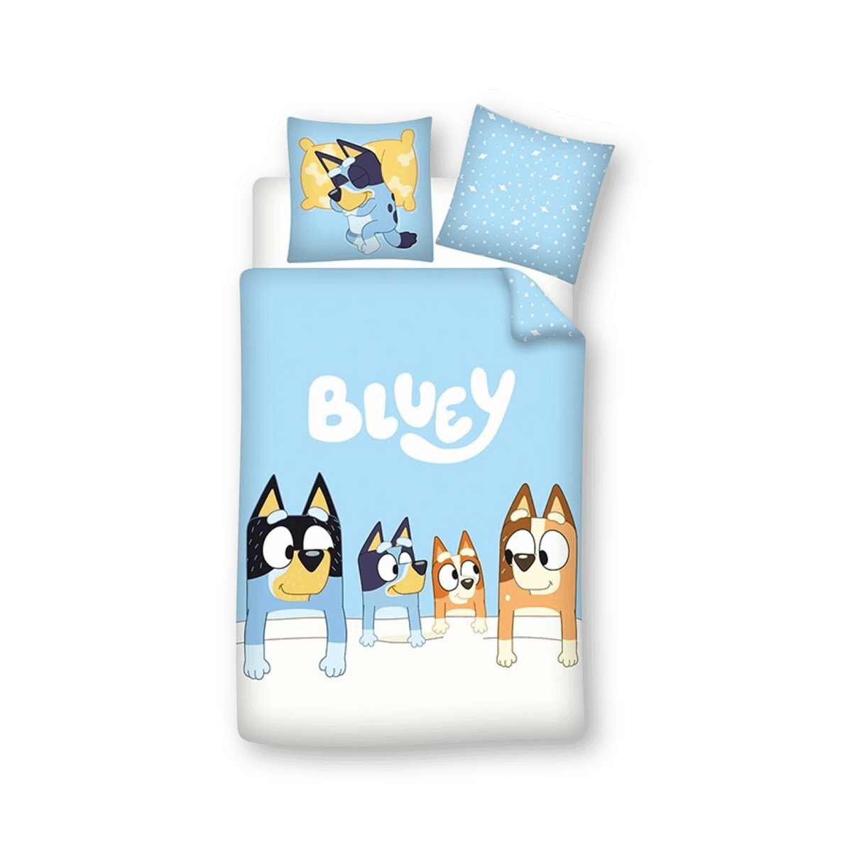 Breng de vrolijke wereld van BLUEY naar de slaapkamer met dit schattige dekbedovertrek! De hele familie Heeler – Bluey, Bingo, Bandit en Chilli – staat afgebeeld. Ideaal voor jonge Bluey-fans die elke nacht willen wegdromen met hun favoriete hondenvriendjes dicht bij zich!