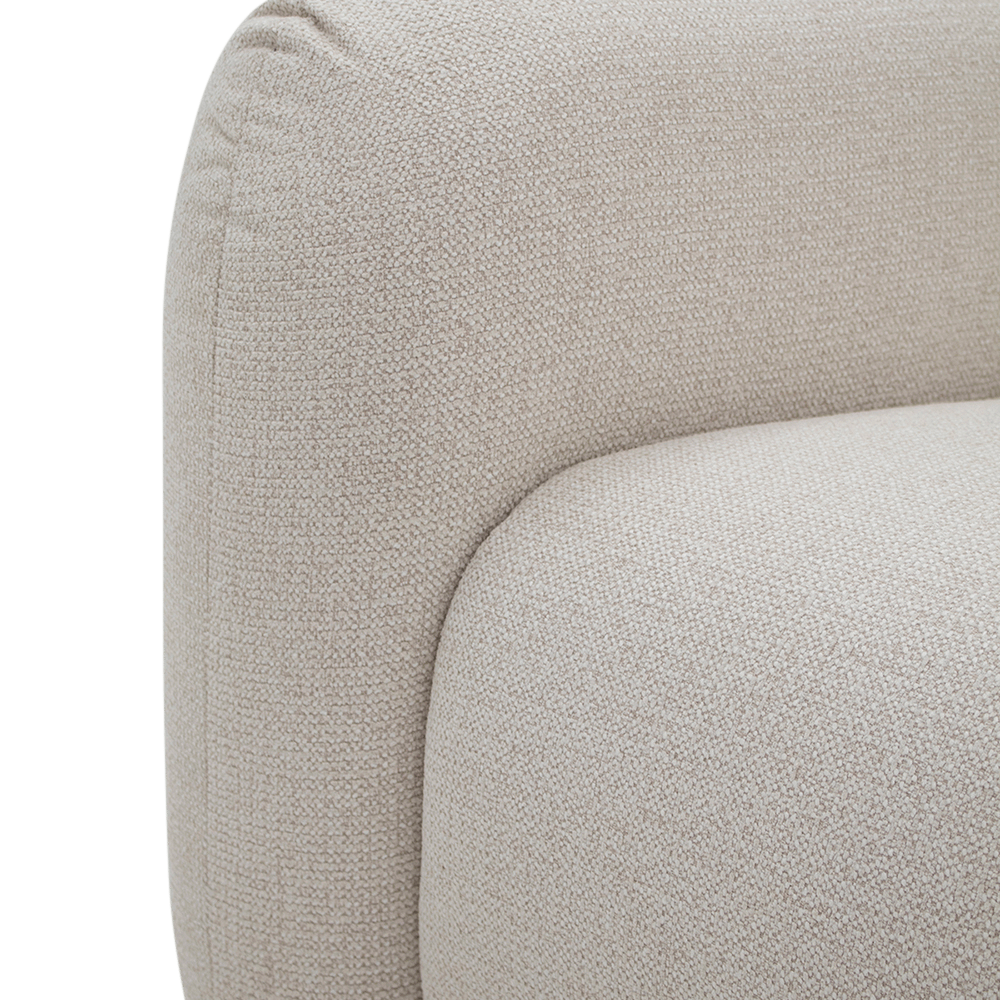 De subtiele, ronde vormen geven de salon een moderne, elegante uitstraling. De lichte beige stof zorgt voor een warme, natuurlijke sfeer en past moeiteloos in zowel minimalistische als Scandinavische interieurs.