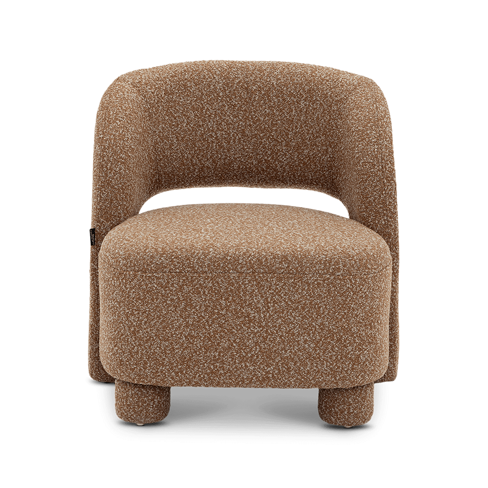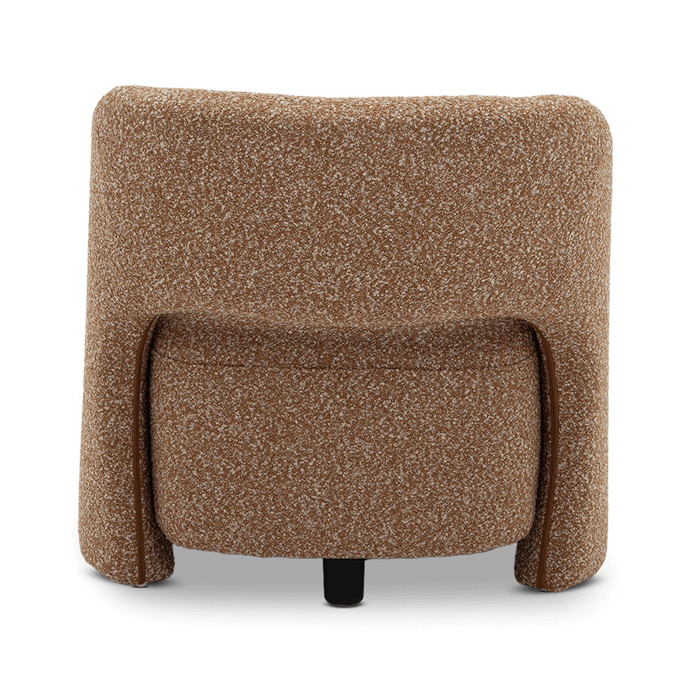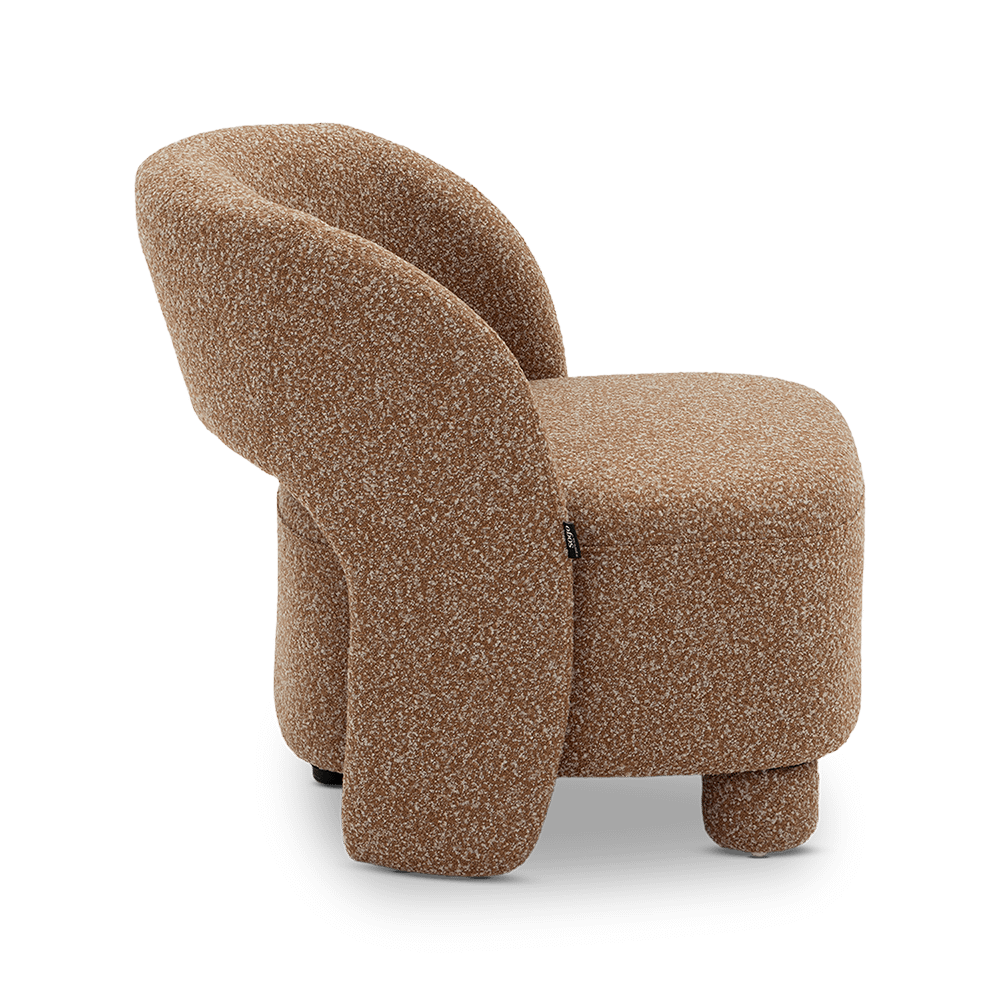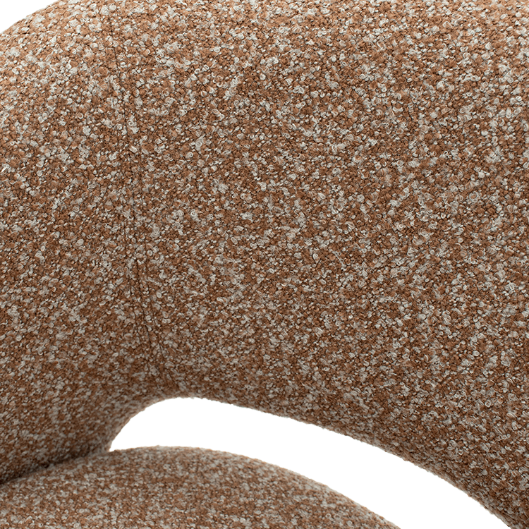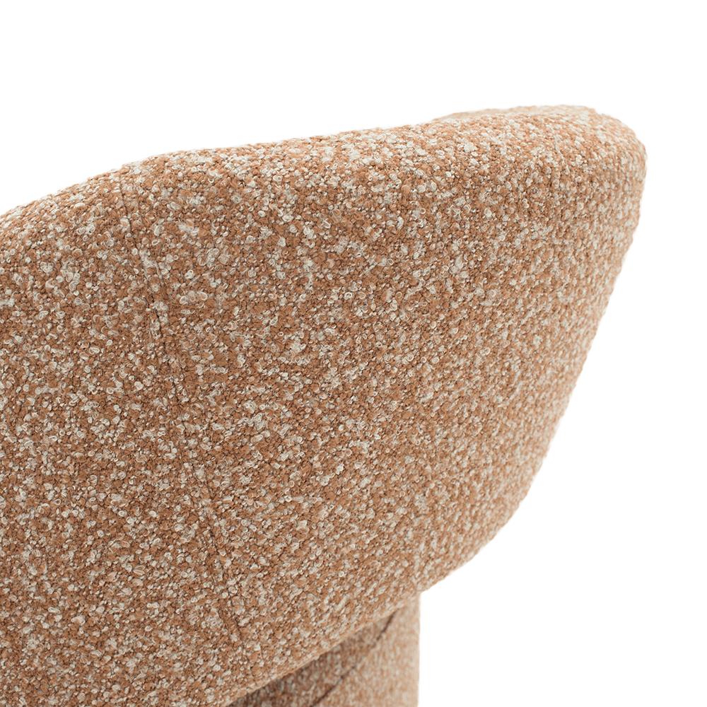 Fauteuil BOLLA in Burnt Orange combineert speelse, afgeronde vormen met een zachte bouclé stof voor een warme en uitnodigende uitstraling.