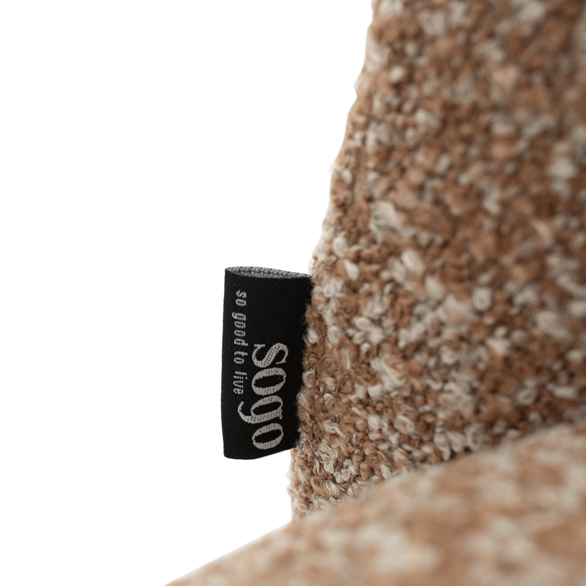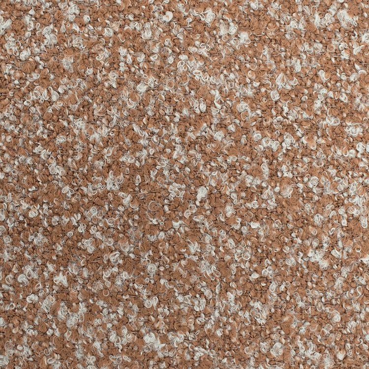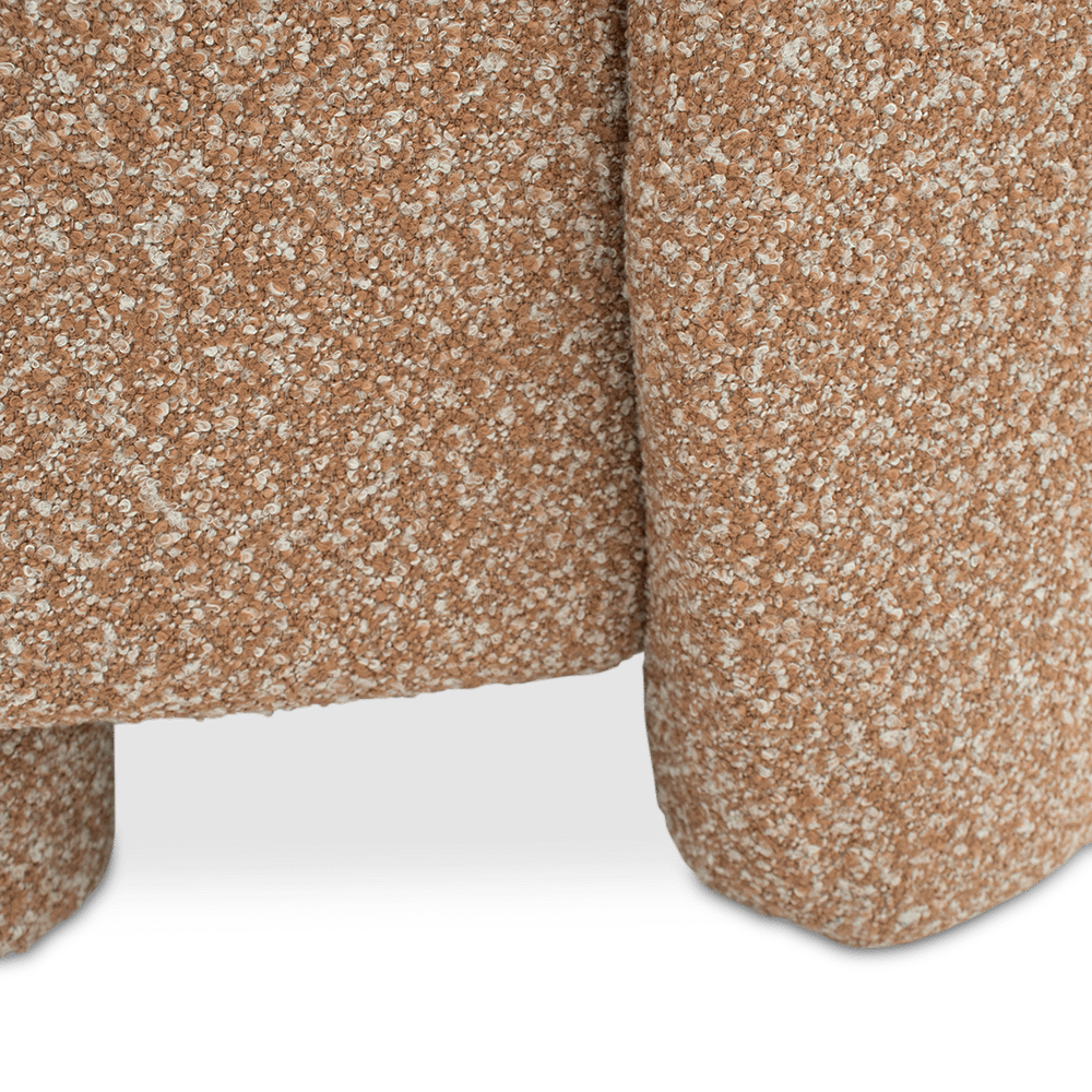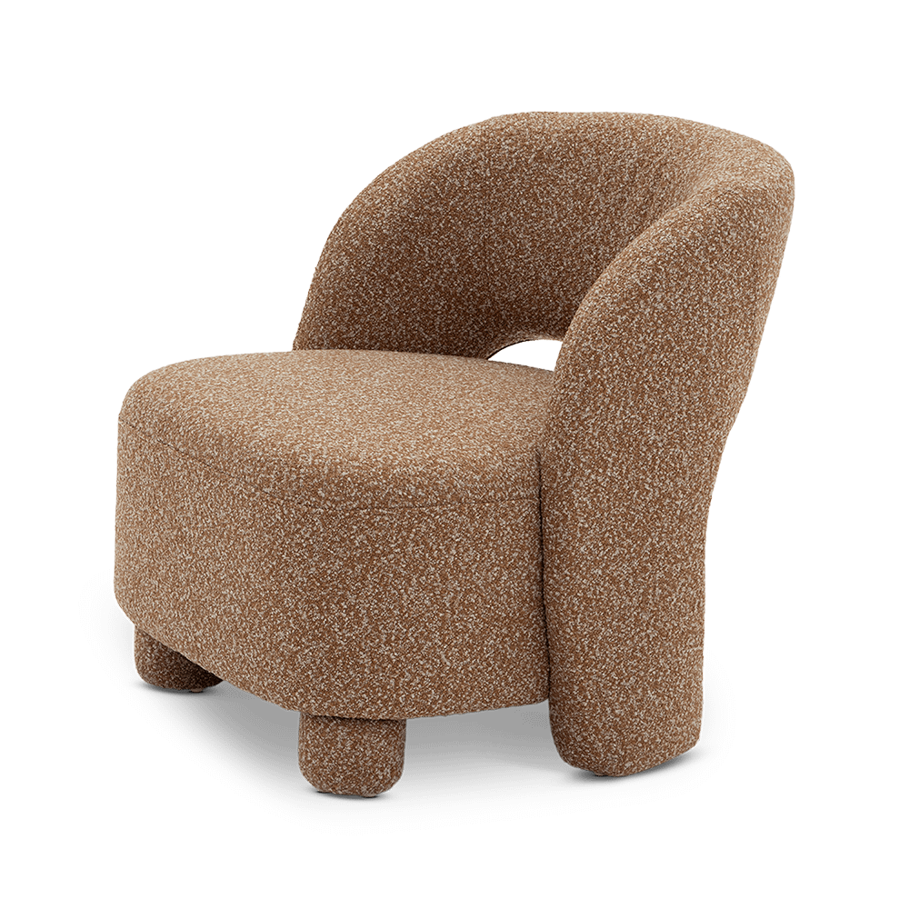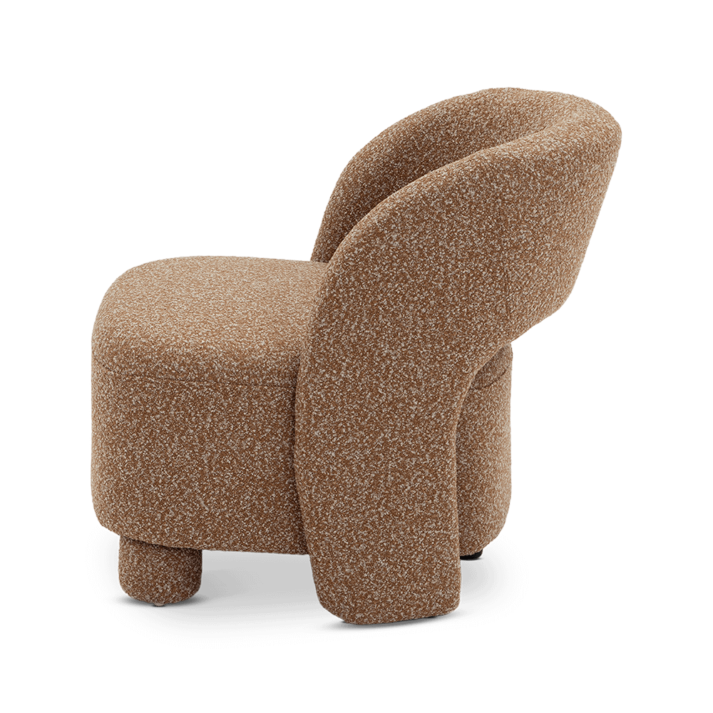 Fauteuil BOLLA in Burnt Orange combineert speelse, afgeronde vormen met een zachte bouclé stof voor een warme en uitnodigende uitstraling.