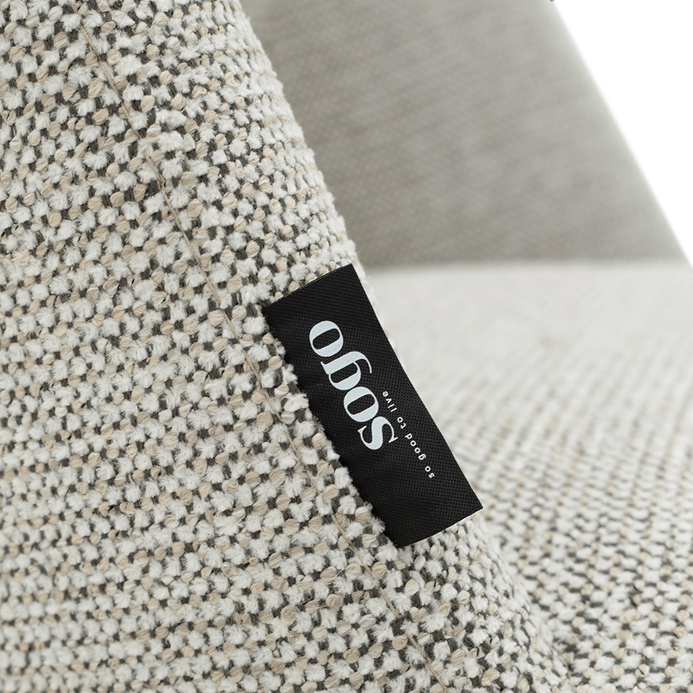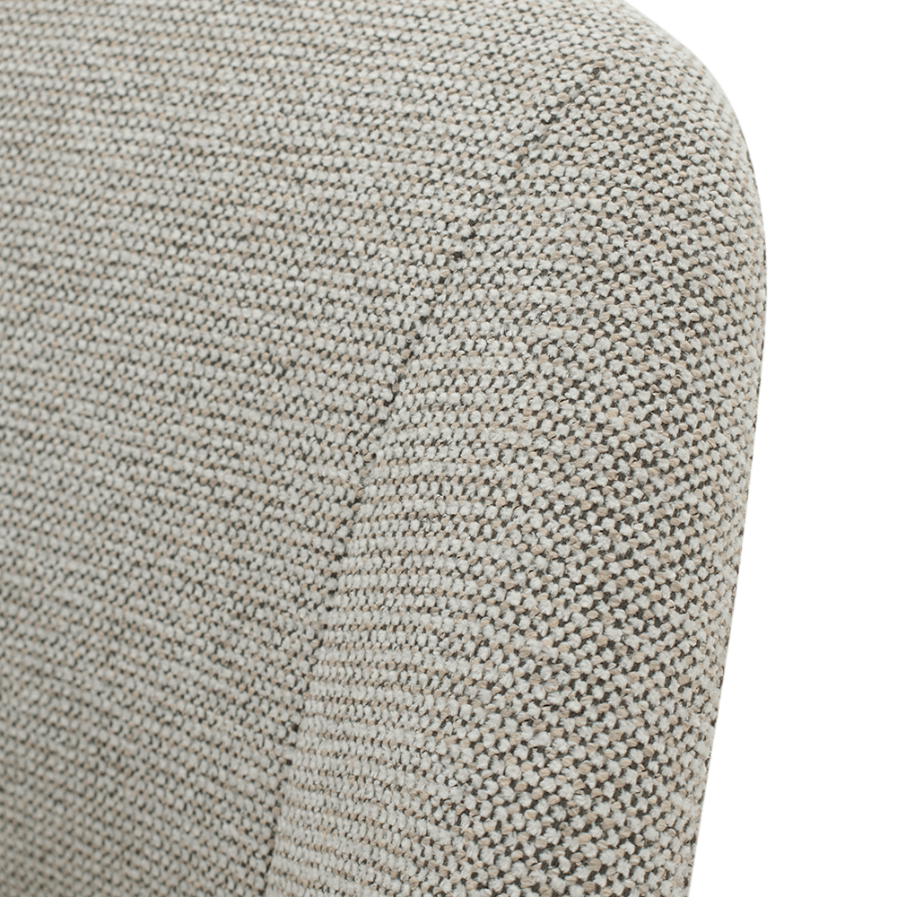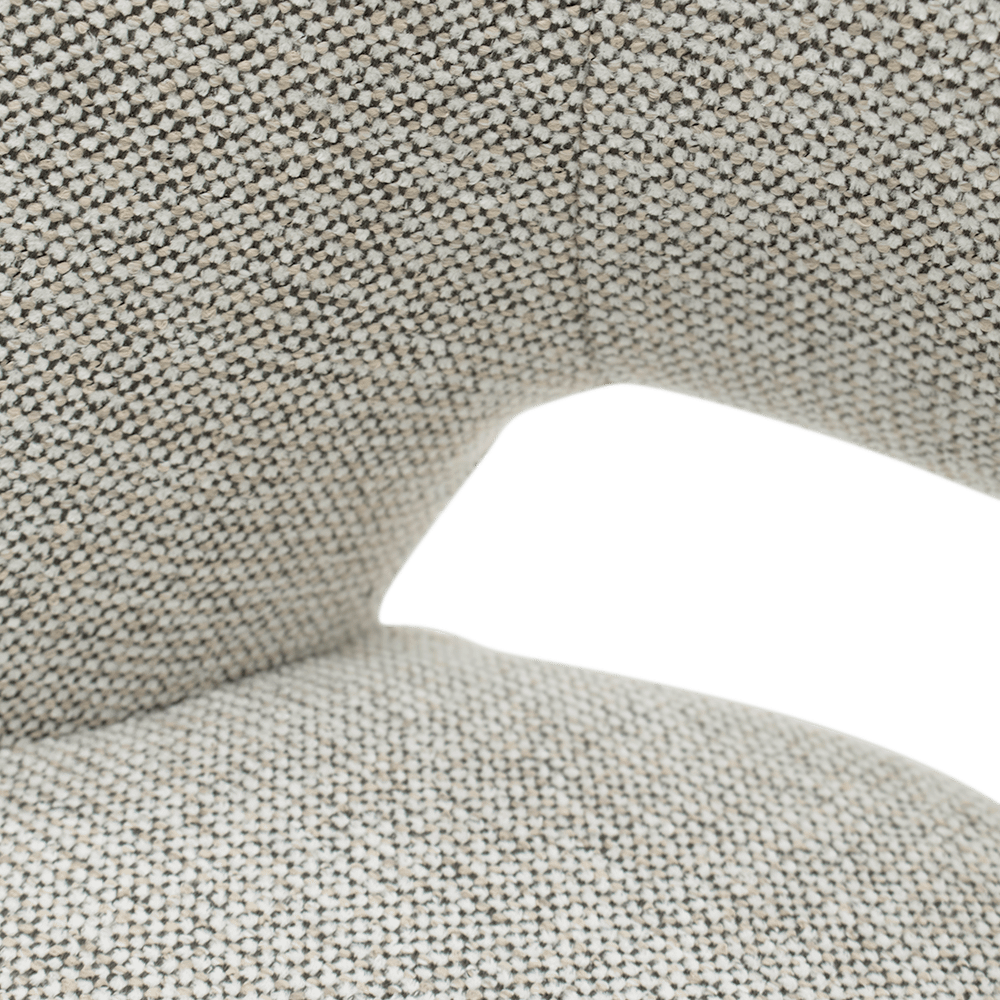 De afgeronde rugleuning met subtiele opening en de zachte bekleding in de stof Sneak 01 Natural zorgen voor een verfijnde, luchtige uitstraling.