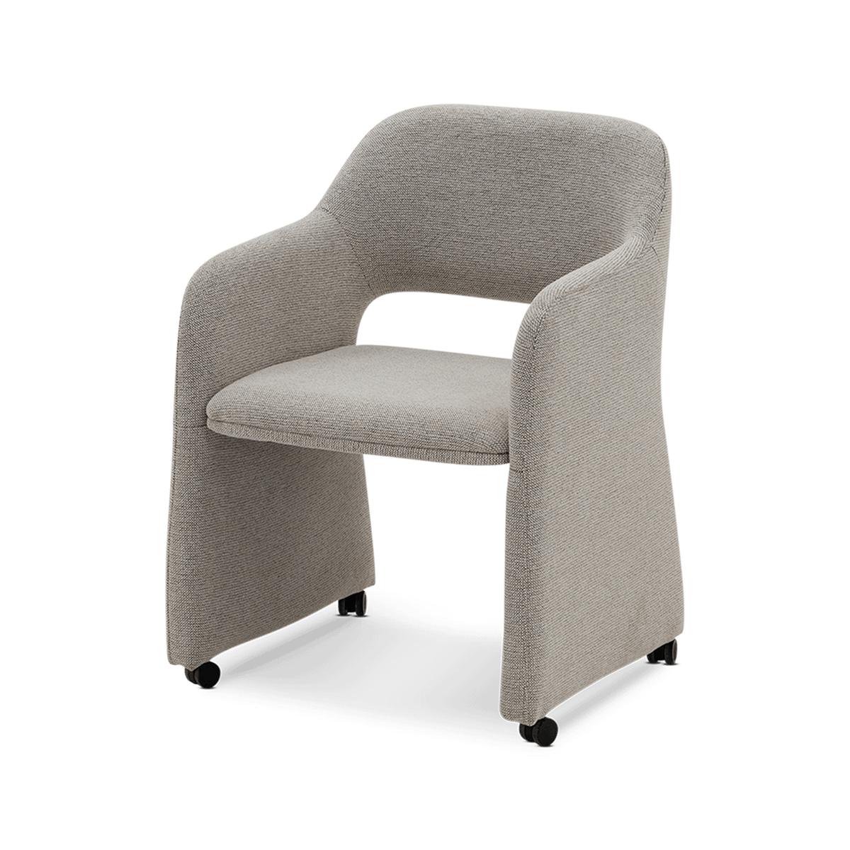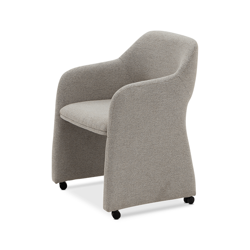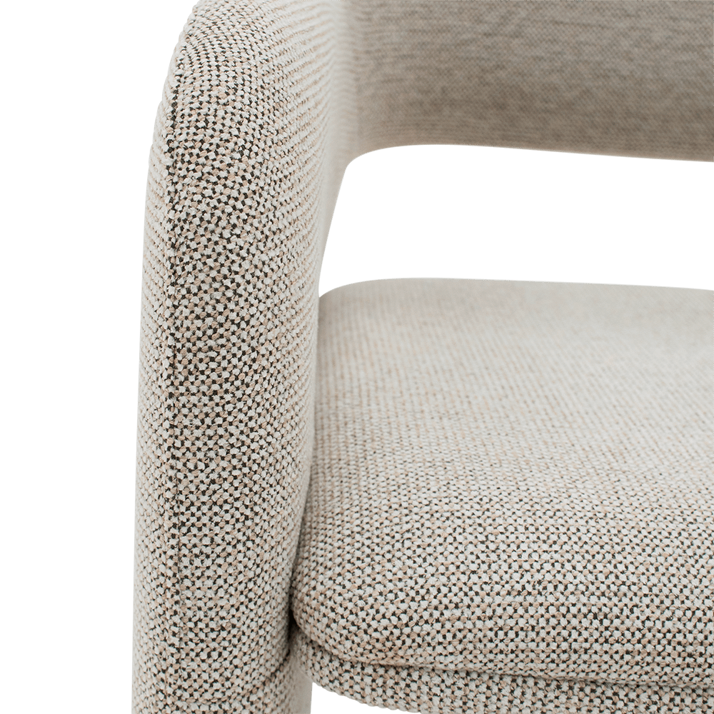 Bekleed in stof Sneak 01 Natural, voelt deze stoel zacht aan en straalt hij rust en verfijning uit. De vloeiende lijnen en volledig gestoffeerde armleuningen zorgen voor een comfortabele zit, terwijl de onzichtbare wieltjes de stoel bijzonder praktisch maken — ideaal voor aan de eettafel of in een home office. CARRIE brengt stijl en gebruiksgemak samen in één moderne en tijdloze uitvoering.