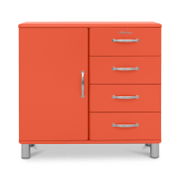 The Rebel. Meet MALIBU. Geïnspireerd door de jaren '50 en '60 waarin jongeren via muziek, mode en kunst naar manieren zochten om zich af te zetten tegen gevestigde waarden, viert Malibu de Rock 'n Roll spirit waarin vrijheid en persoonlijkheid centraal staan. Malibu is jong, rebels en heerlijk kleurrijk! Met zijn stijlvolle, retro design dat het midden houdt tussen modern en retro, en zijn 9 happy colors, is Malibu een ode aan de vrije geest van de Amerikaanse surfcultuur midden vorige eeuw. Deze commode heeft 1 deur met legplanken en 4 lades, en heeft een breedte van 98cm, een diepte van 41cm en een hoogte van 92cm.