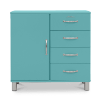 The Rebel. Meet MALIBU. Geïnspireerd door de jaren '50 en '60 waarin jongeren via muziek, mode en kunst naar manieren zochten om zich af te zetten tegen gevestigde waarden, viert Malibu de Rock 'n Roll spirit waarin vrijheid en persoonlijkheid centraal staan. Malibu is jong, rebels en heerlijk kleurrijk! Met zijn stijlvolle, retro design dat het midden houdt tussen modern en retro, en zijn 9 happy colors, is Malibu een ode aan de vrije geest van de Amerikaanse surfcultuur midden vorige eeuw. Deze commode heeft 1 deur met legplanken en 4 lades, en heeft een breedte van 98cm, een diepte van 41cm en een hoogte van 92cm.
