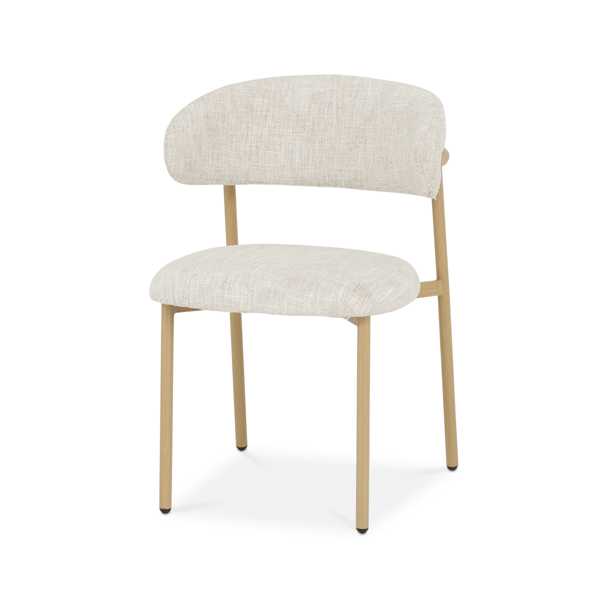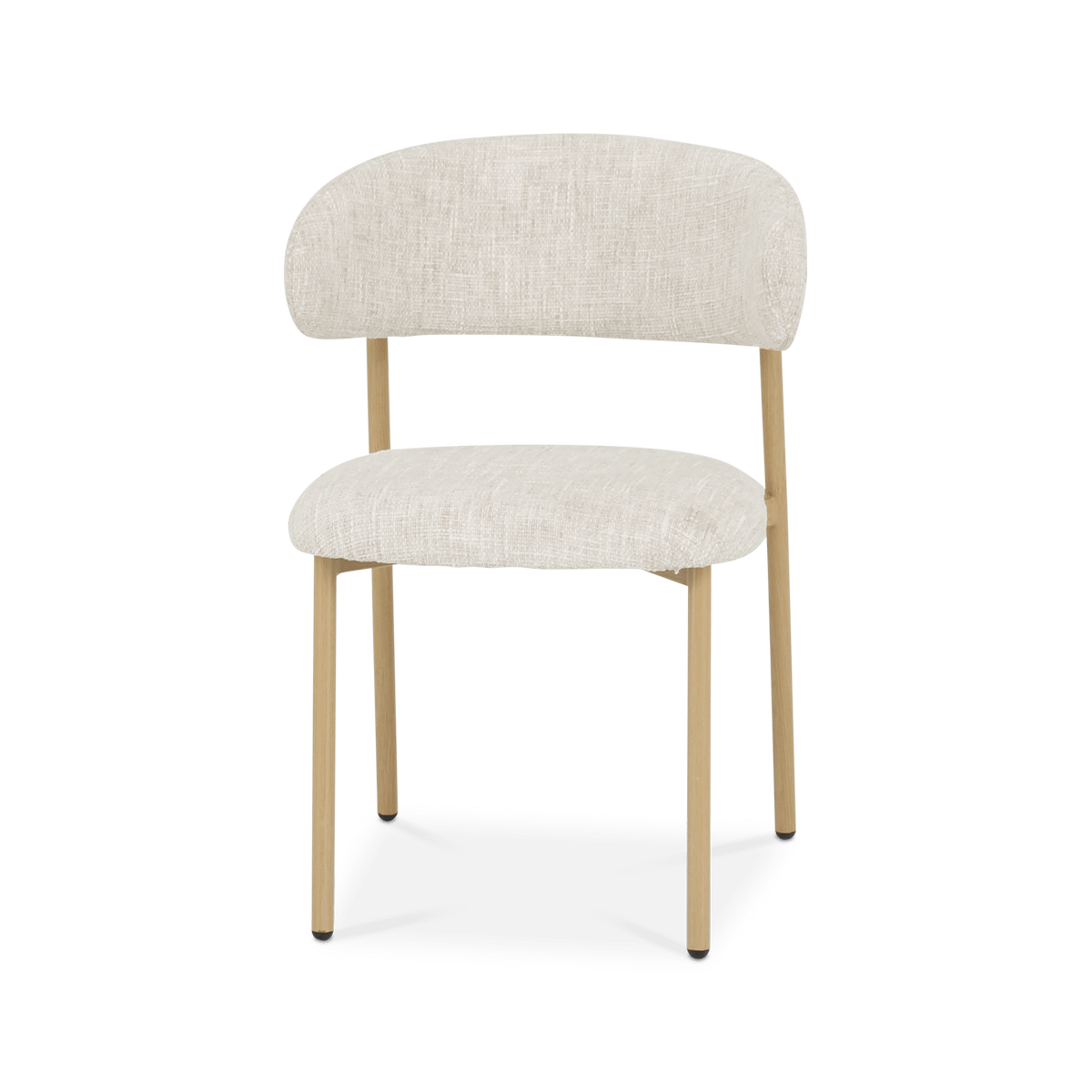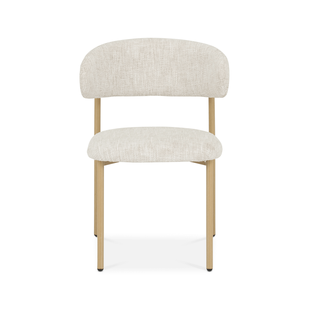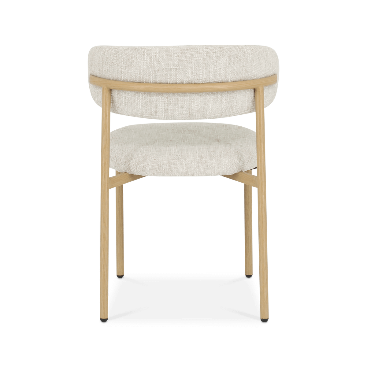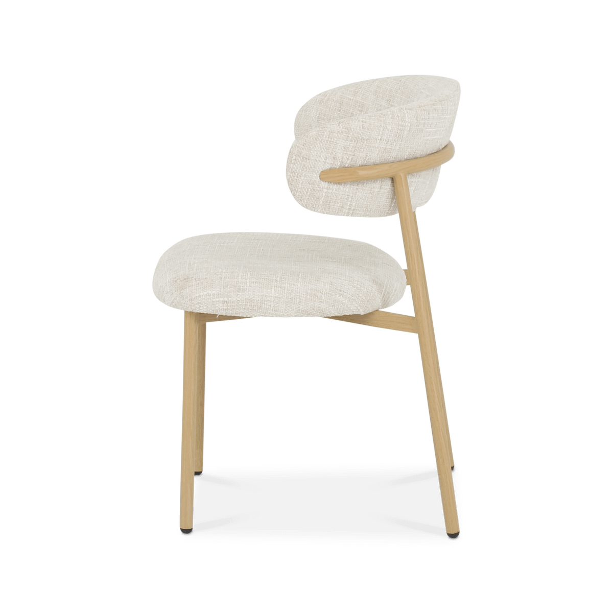 Stoel MARGIT straalt natuurlijke elegantie uit met haar zitting in een zachte natureltint en slanke metalen poten in eiken houtlook. Dit stijlvolle ontwerp combineert moeiteloos comfort met een minimalistische uitstraling, waardoor MARGIT perfect past in zowel moderne als Scandinavische interieurs. De licht gebogen rugleuning zorgt voor een aangename zitervaring, terwijl de houtlook poten warmte en karakter toevoegen aan je eetruimte. Een subtiele eyecatcher met een tijdloze uitstraling!