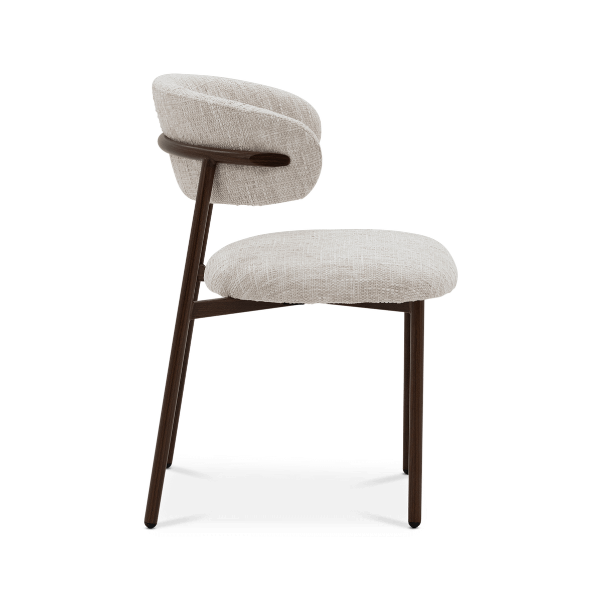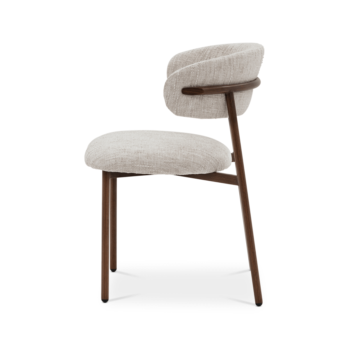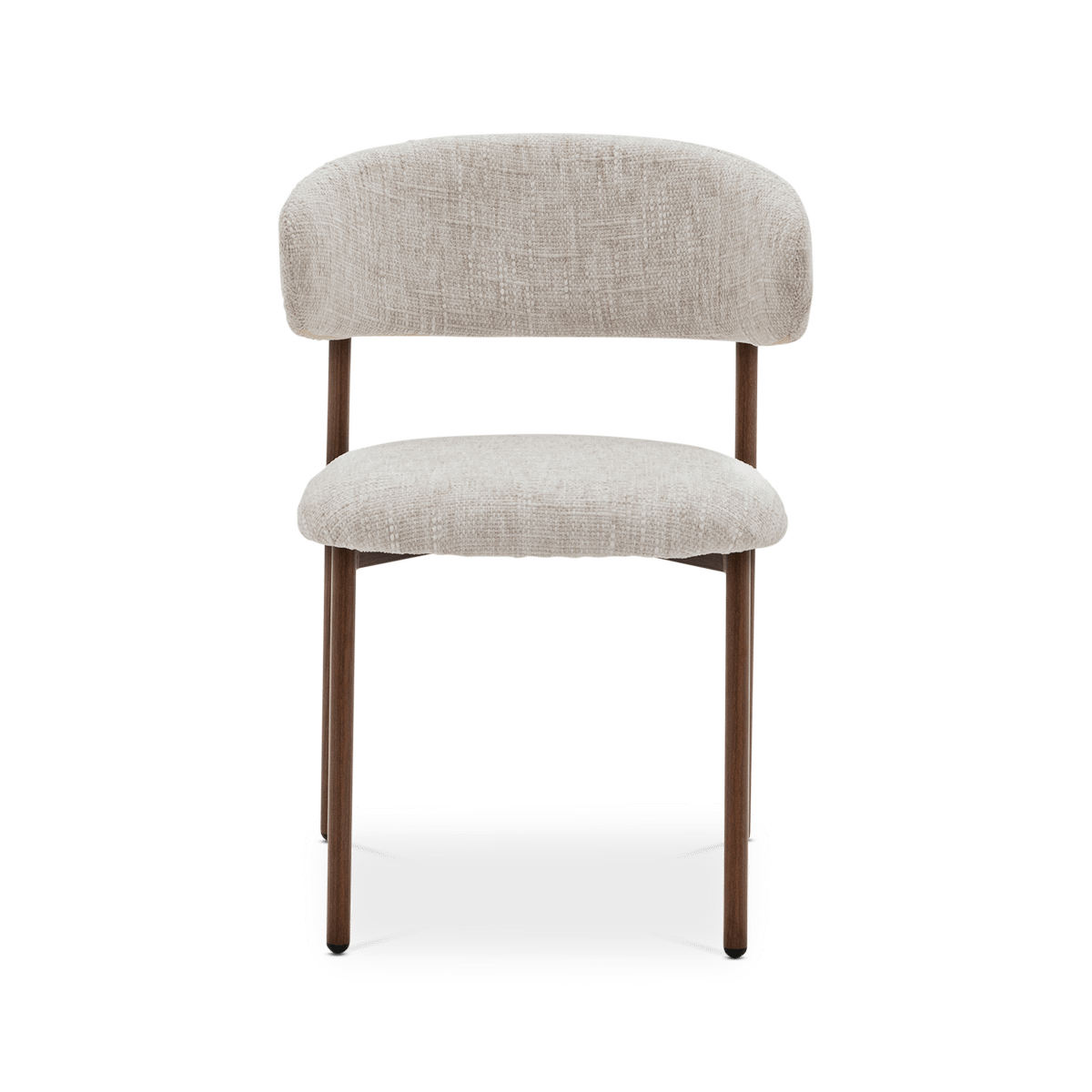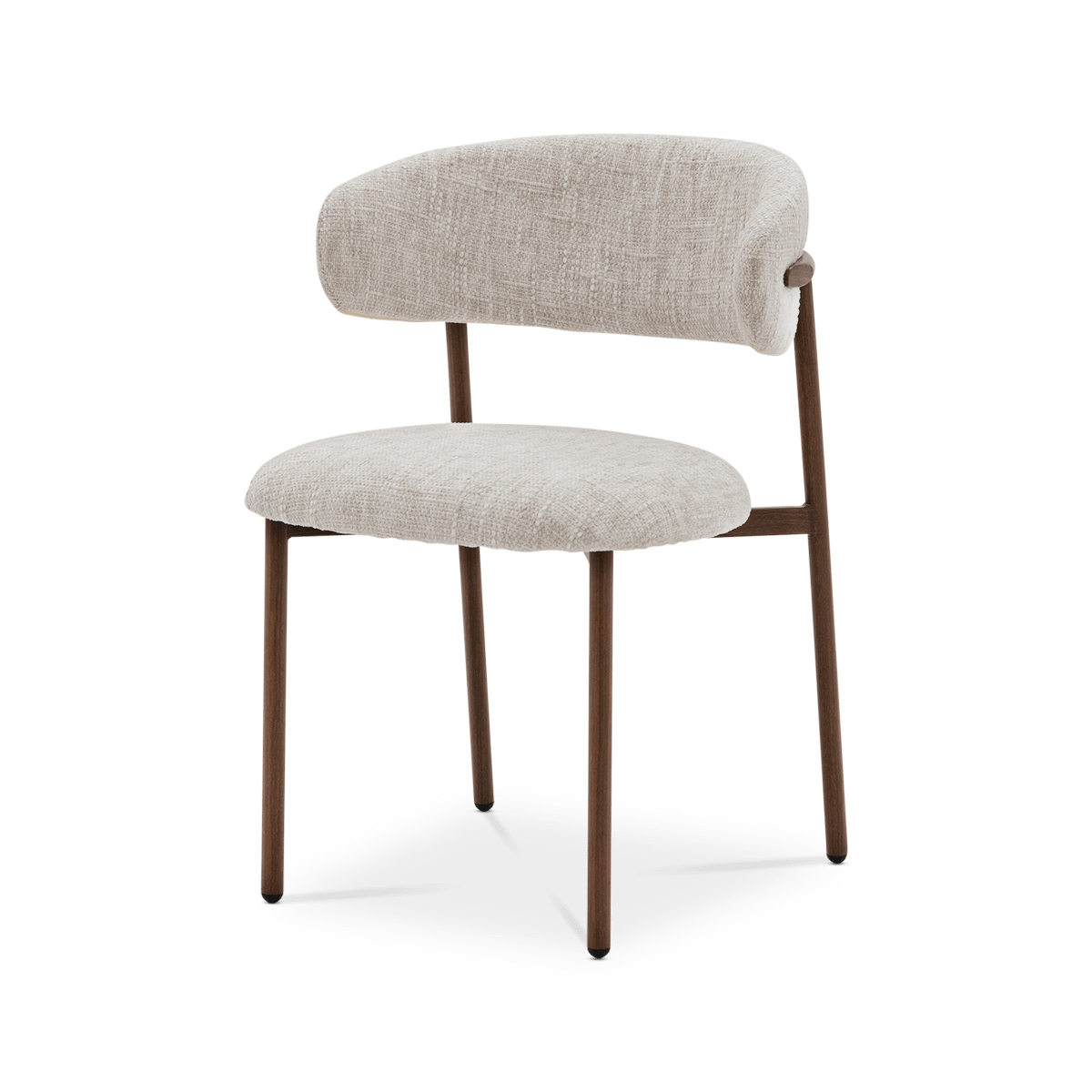 Stoel MARGIT straalt natuurlijke elegantie uit met haar zitting in een zachte natureltint en slanke metalen poten in walnoot houtlook. Dit stijlvolle ontwerp combineert moeiteloos comfort met een minimalistische uitstraling, waardoor MARGIT perfect past in zowel moderne als Scandinavische interieurs. De licht gebogen rugleuning zorgt voor een aangename zitervaring, terwijl de houtlook poten warmte en karakter toevoegen aan je eetruimte. Een subtiele eyecatcher met een tijdloze uitstraling!