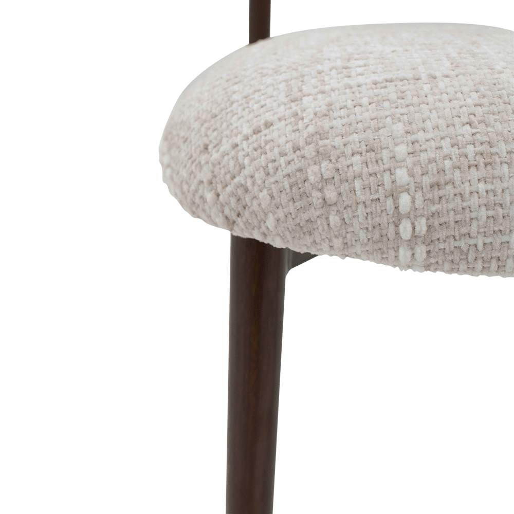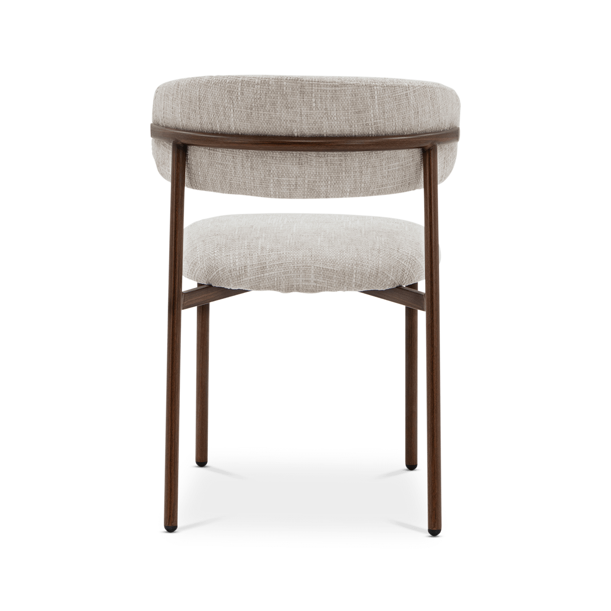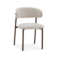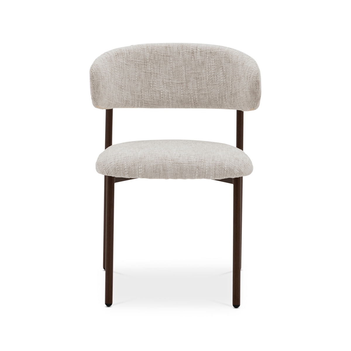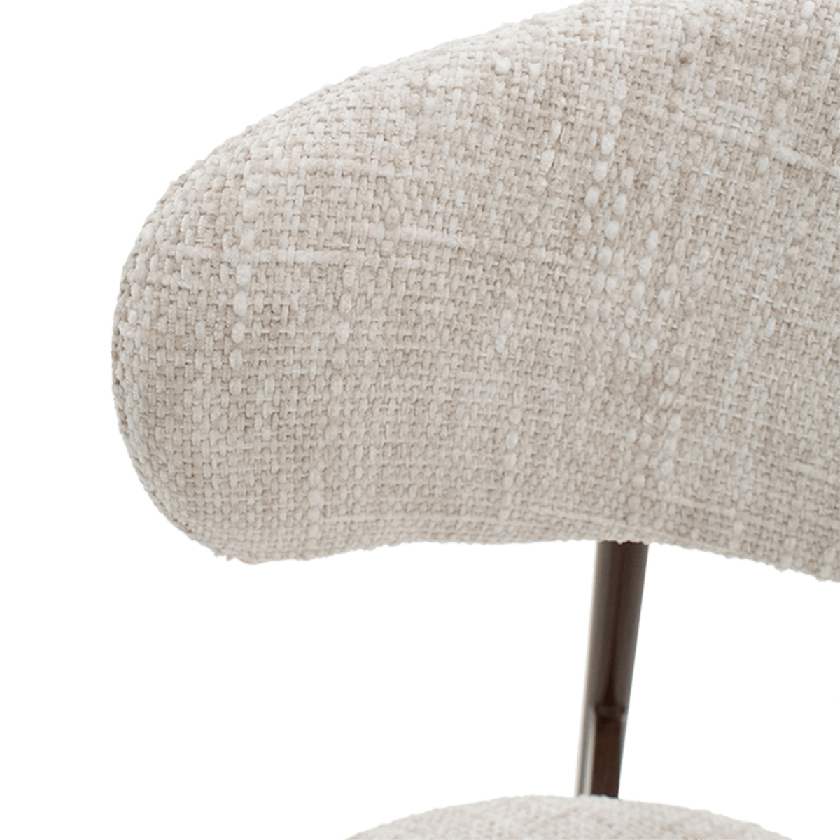 Stoel MARGIT straalt natuurlijke elegantie uit met haar zitting in een zachte natureltint en slanke metalen poten in walnoot houtlook. Dit stijlvolle ontwerp combineert moeiteloos comfort met een minimalistische uitstraling, waardoor MARGIT perfect past in zowel moderne als Scandinavische interieurs. De licht gebogen rugleuning zorgt voor een aangename zitervaring, terwijl de houtlook poten warmte en karakter toevoegen aan je eetruimte. Een subtiele eyecatcher met een tijdloze uitstraling!