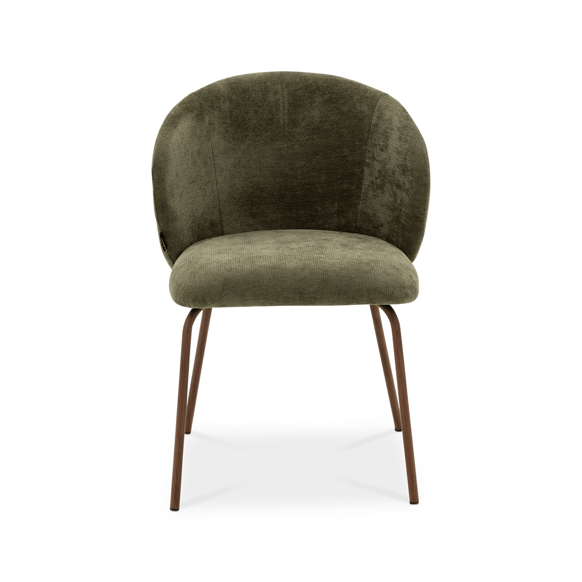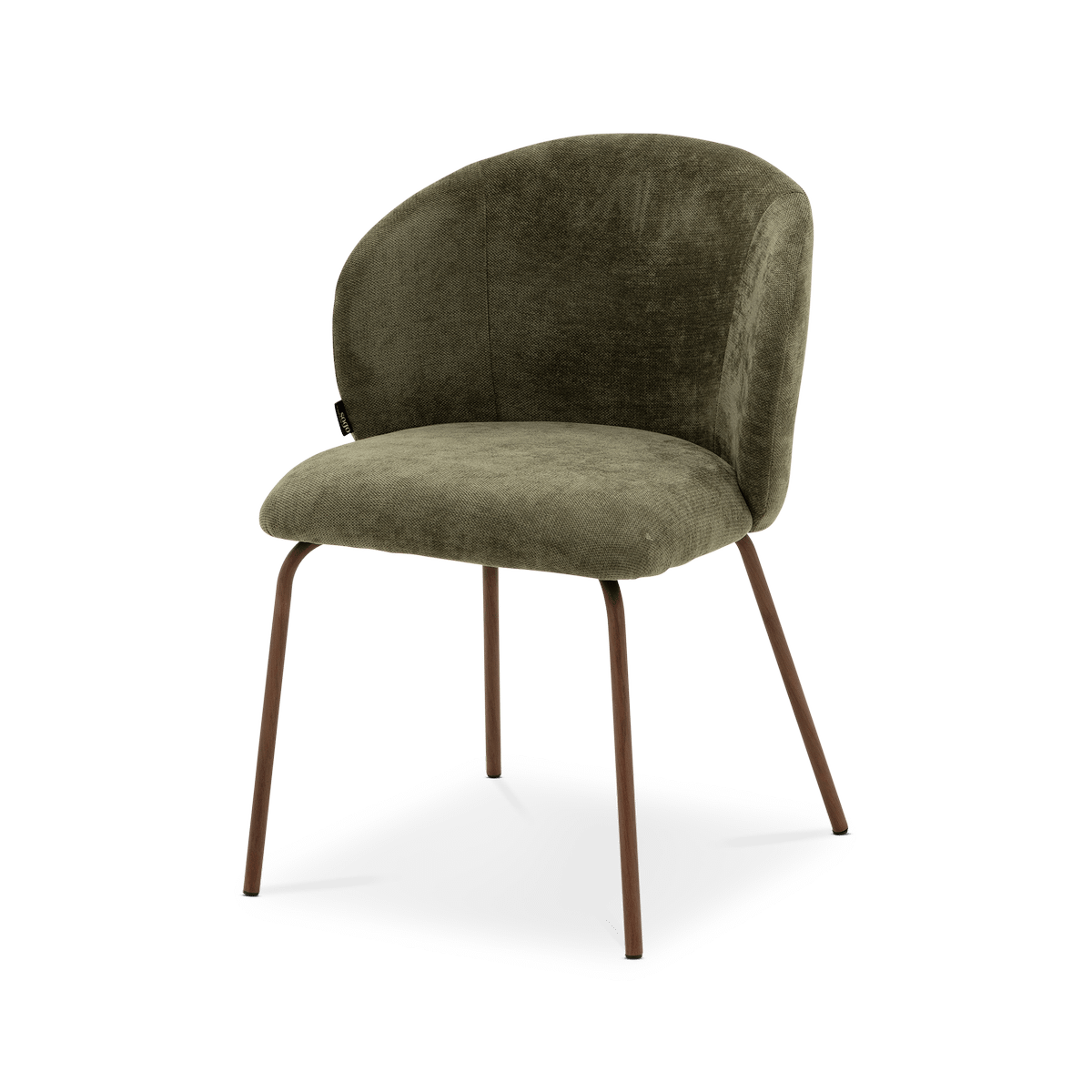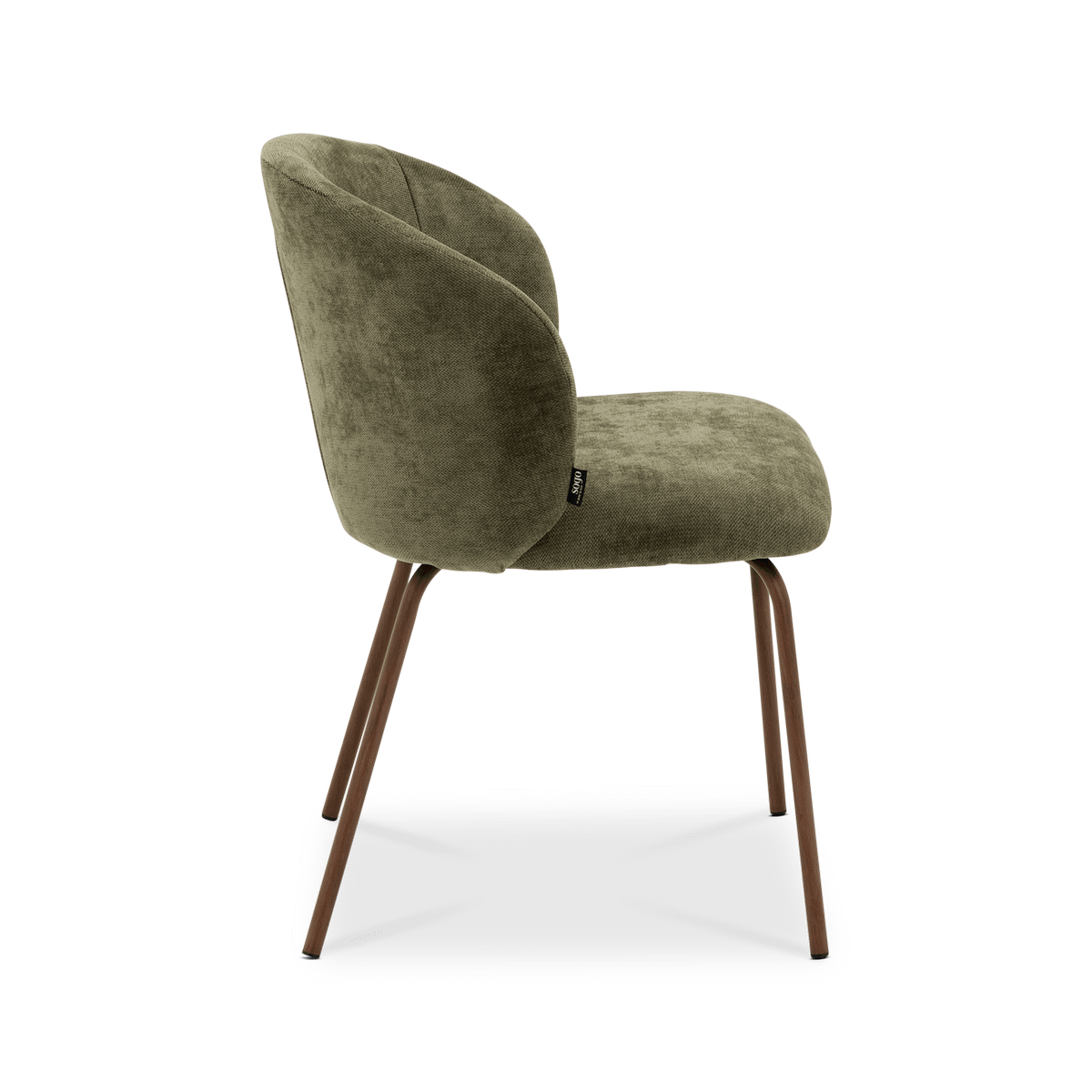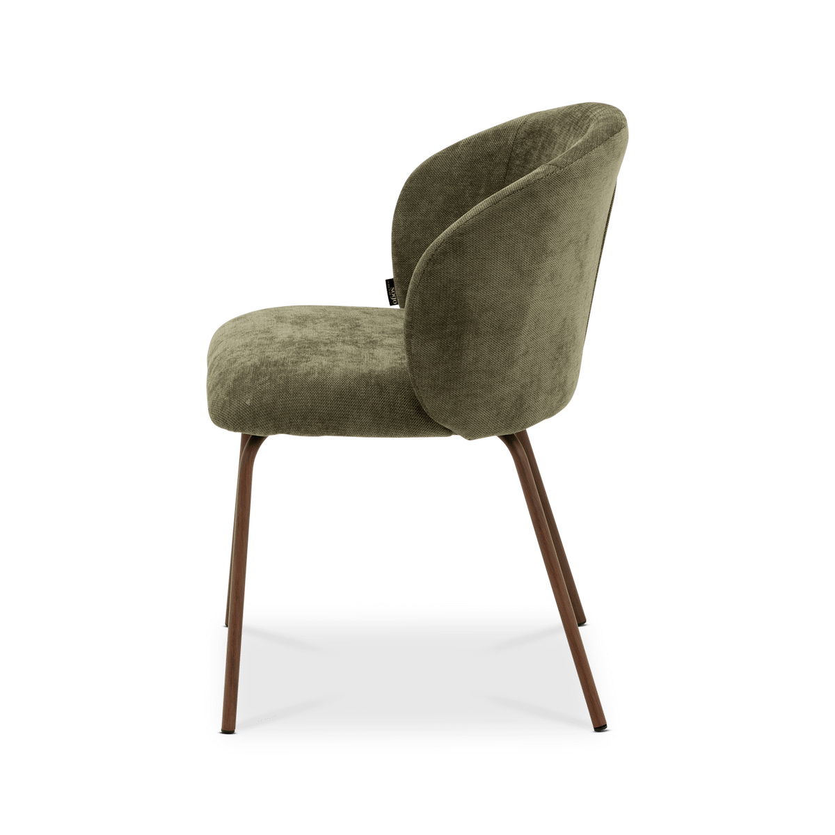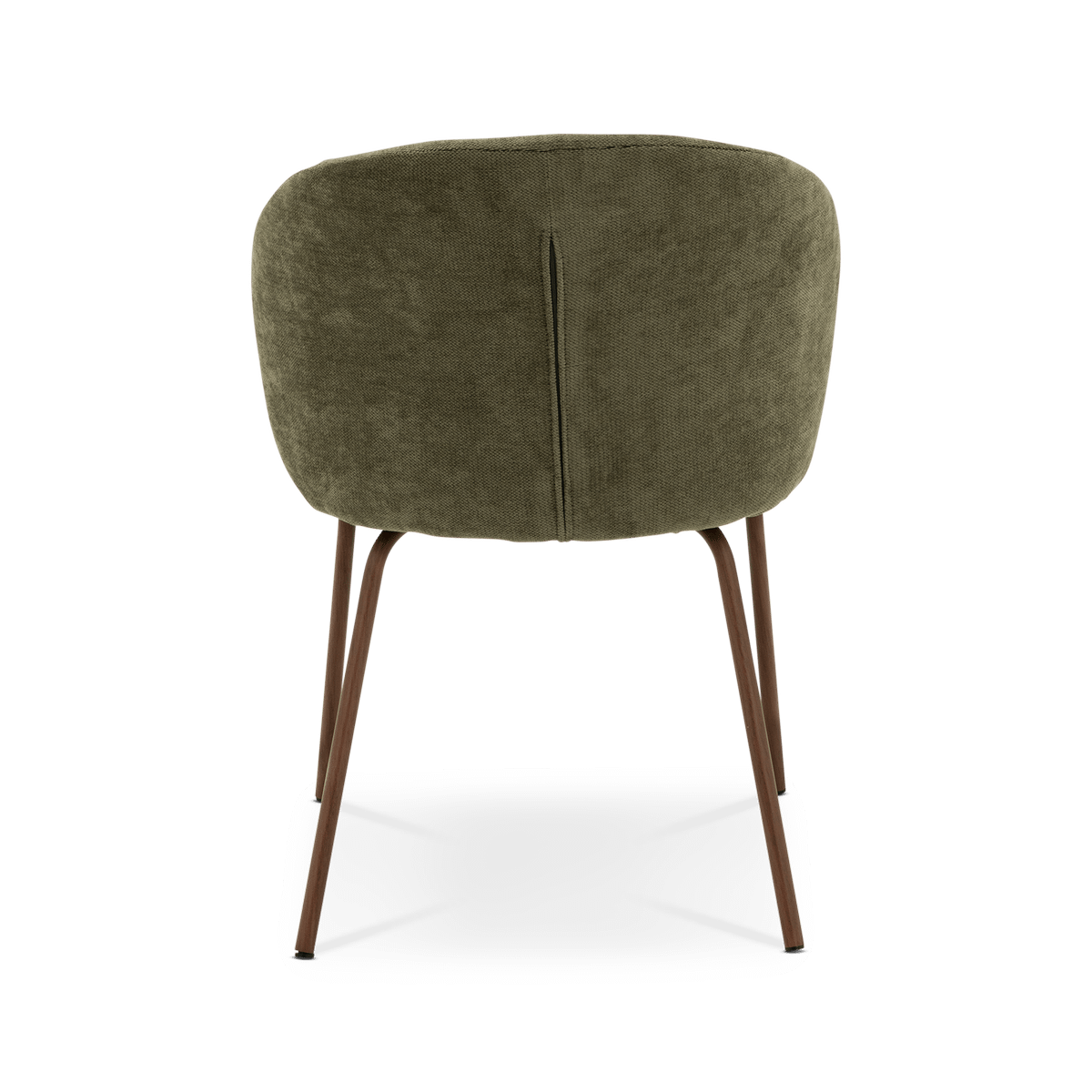 Dankzij de afgeronde rugleuning biedt de stoel optimale steun en een aangenaam zitgevoel. De metalen poten in Walnut foil zorgen voor een elegant contrast met de diepe mosgroene tint van de stof.