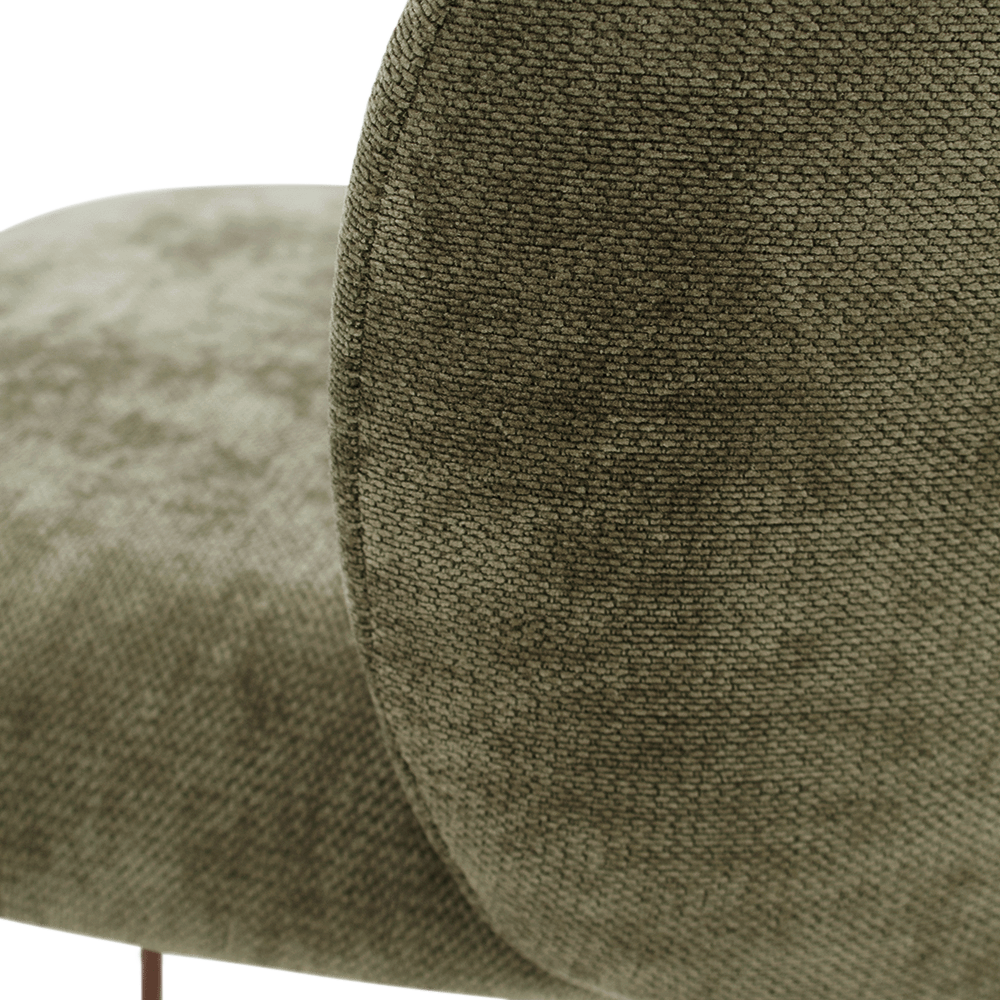 De YENER Stoel in de kleur Moss Cloud straalt warmte en verfijning uit. De fluweelzachte bekleding geeft een subtiele glans die prachtig speelt met het licht en zorgt voor een luxe, comfortabele uitstraling.