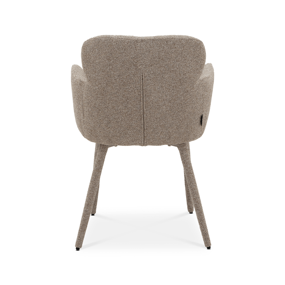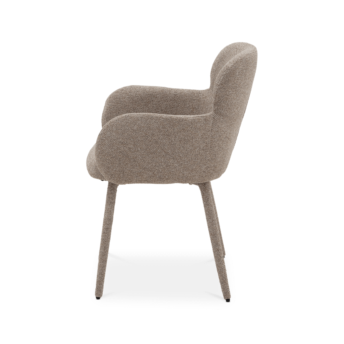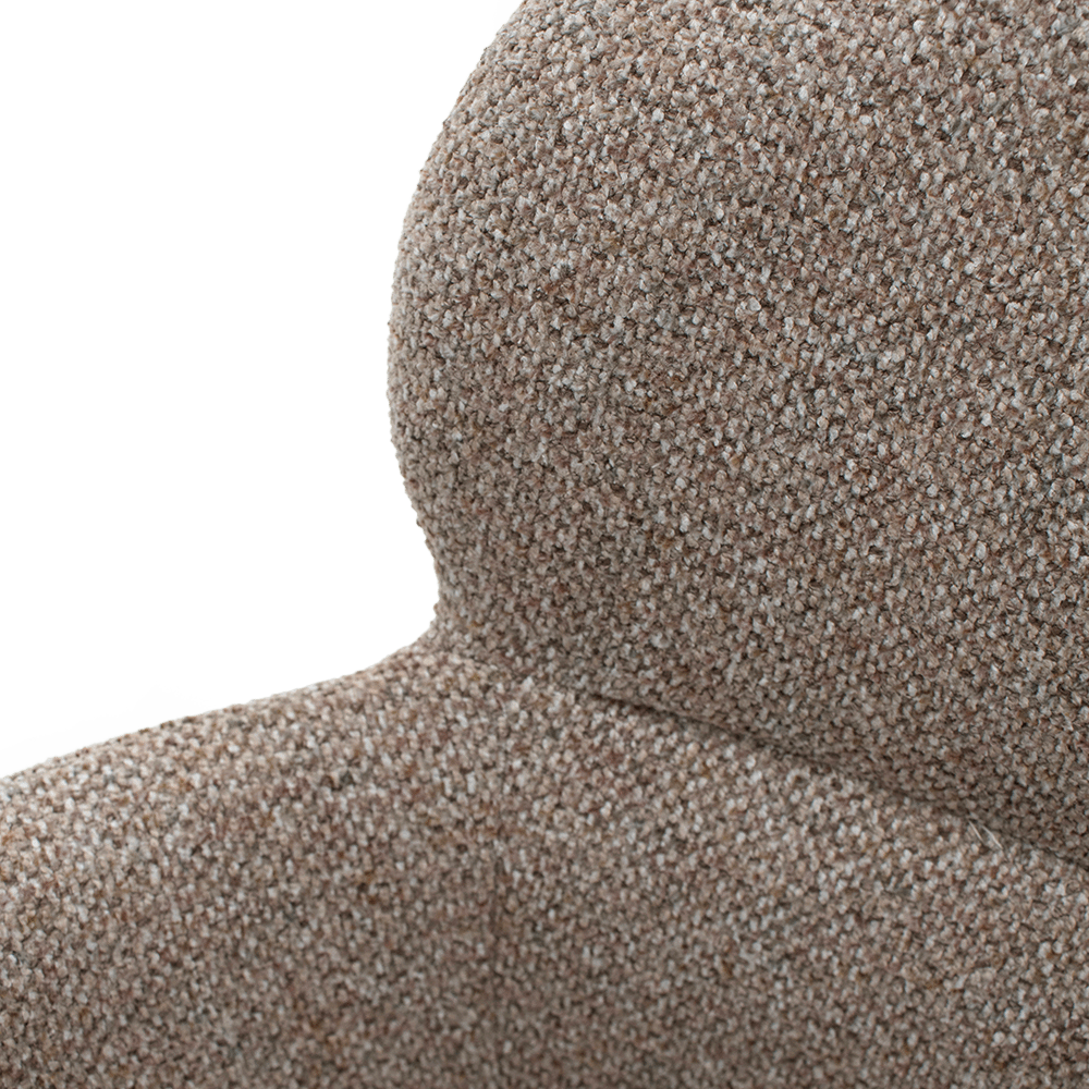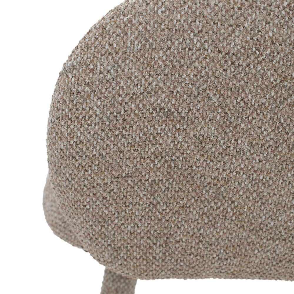 Stoel JILL straalt comfort en elegantie uit met haar zachte, afgeronde vormen. De volledig gestoffeerde poten en armleuningen zorgen voor een harmonieus en luxueus geheel, terwijl de zandkleurige stof een warme en tijdloze uitstraling geeft.
