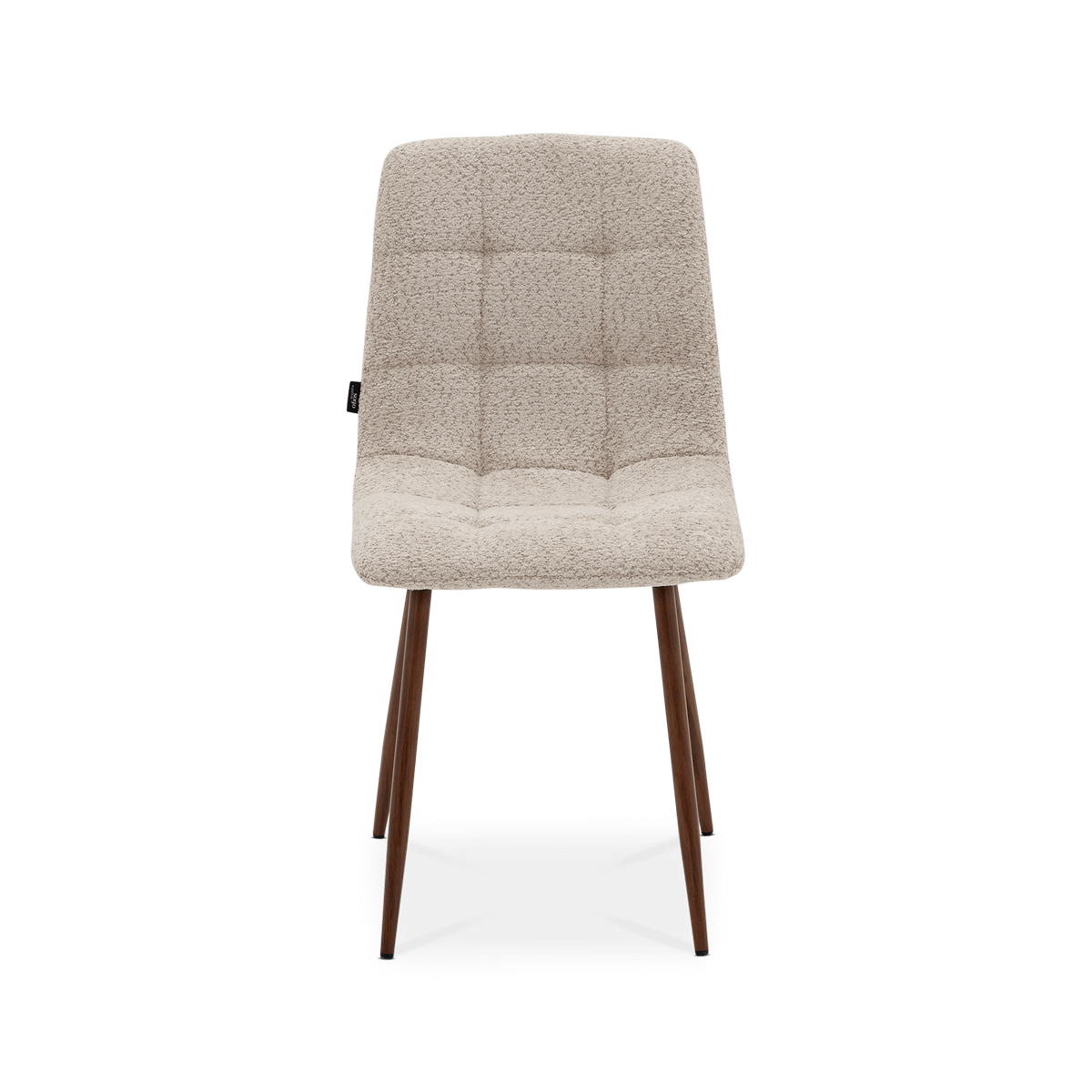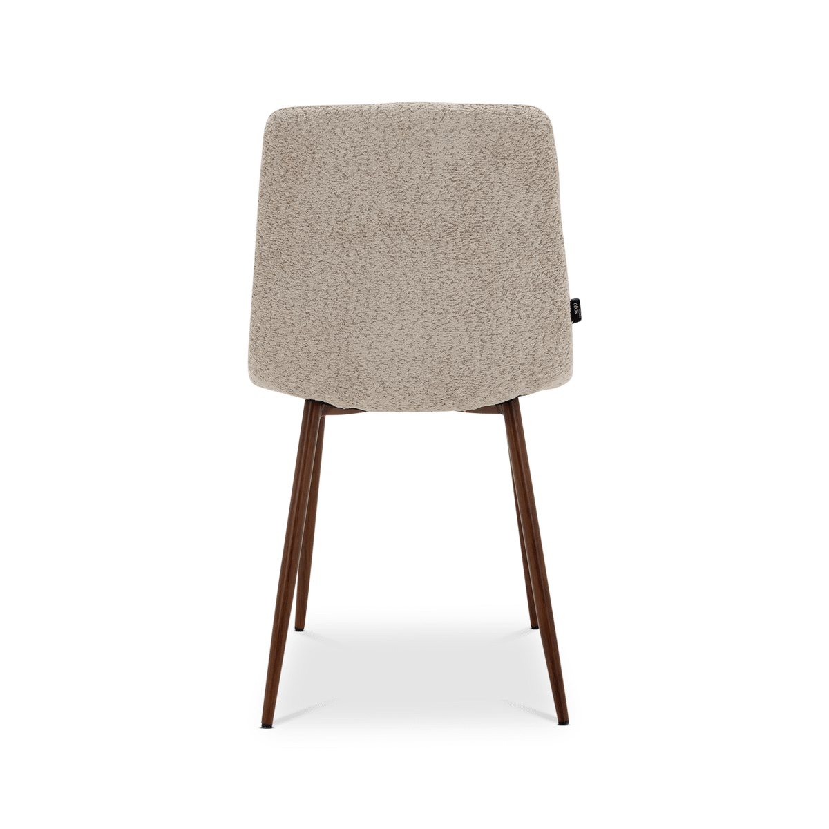 De comfortabele zitting in bouclé beige stof voelt heerlijk warm aan en zorgt voor een luxueuze uitstraling. De walnootkleurige poten geven de stoel een stijlvolle en natuurlijke afwerking.