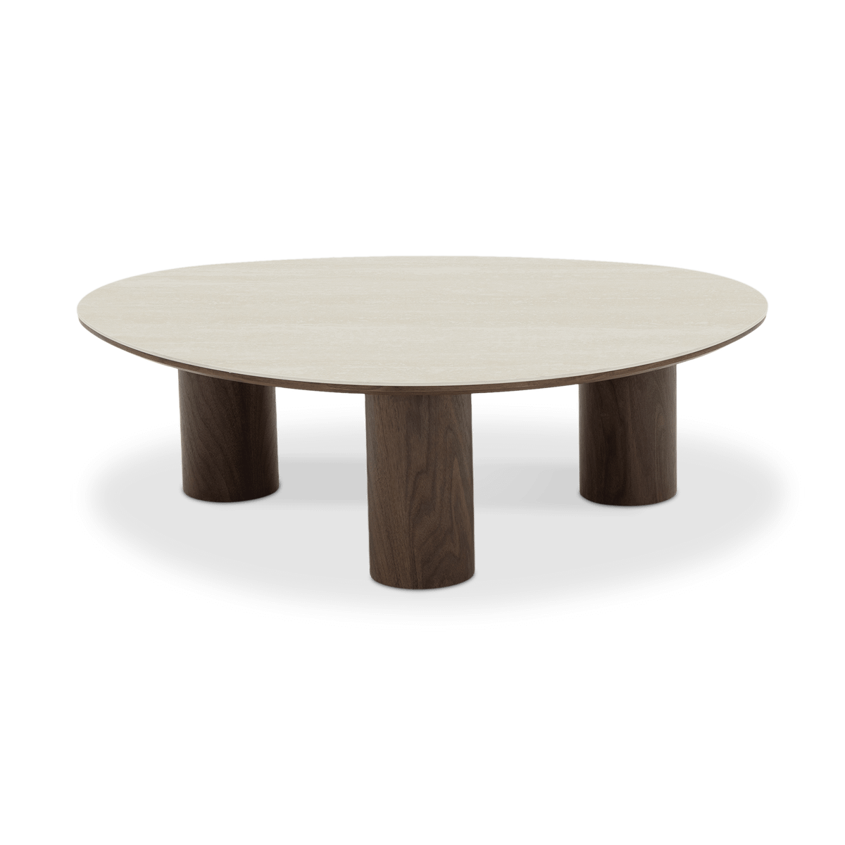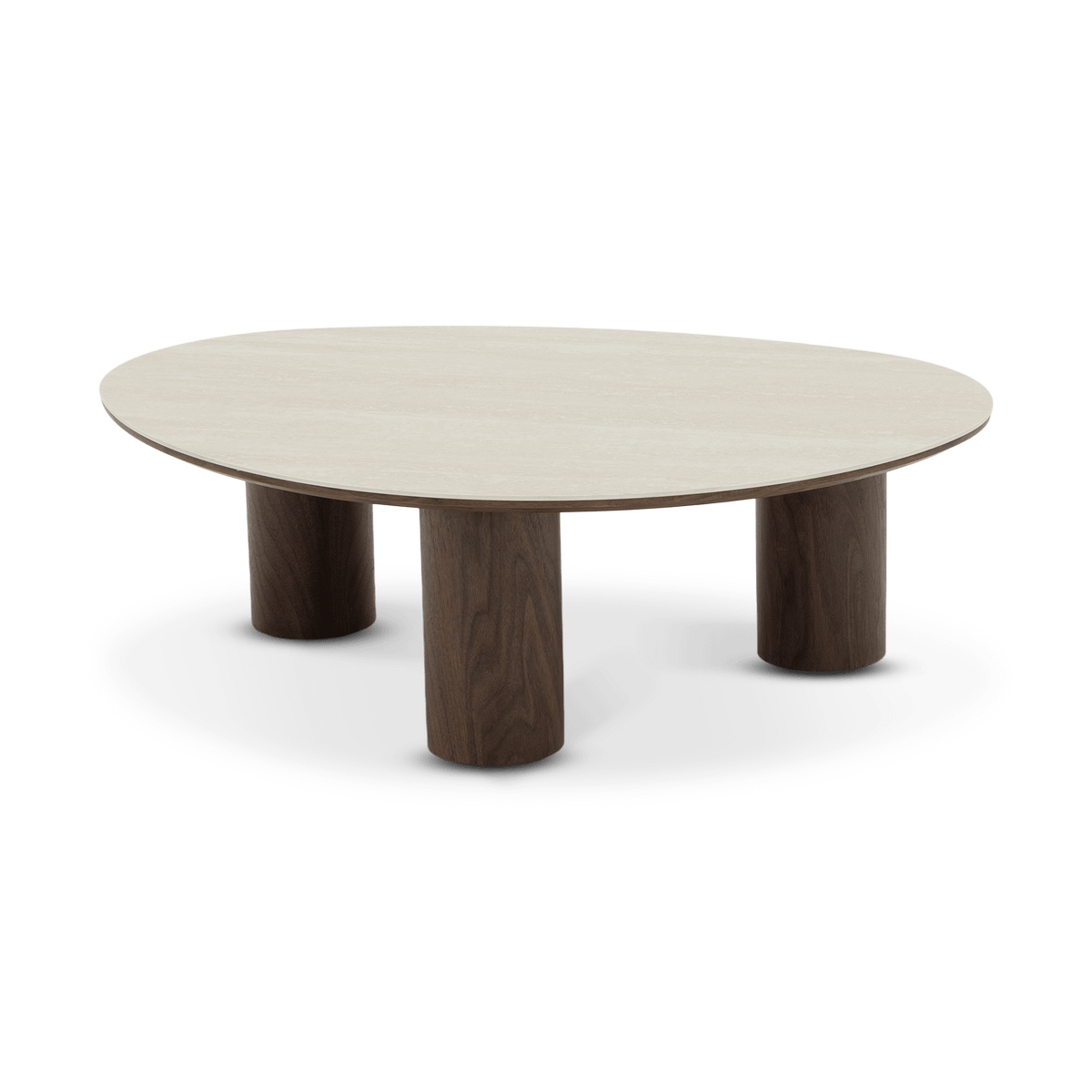 Salontafel ORBINA combineert een elegant travertijnlook tafelblad met warme walnoot accenten.