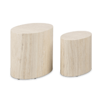 Deze set RIKA van 2 salontafels valt meteen op met zijn interessant design en moderne vormen. Met zijn mooie travertinlook van kop tot teen, is deze salontafel ook helemaal mee met de huidige trends. De ovalen vormen zorgen meteen voor een gesofisticeerde vibe.