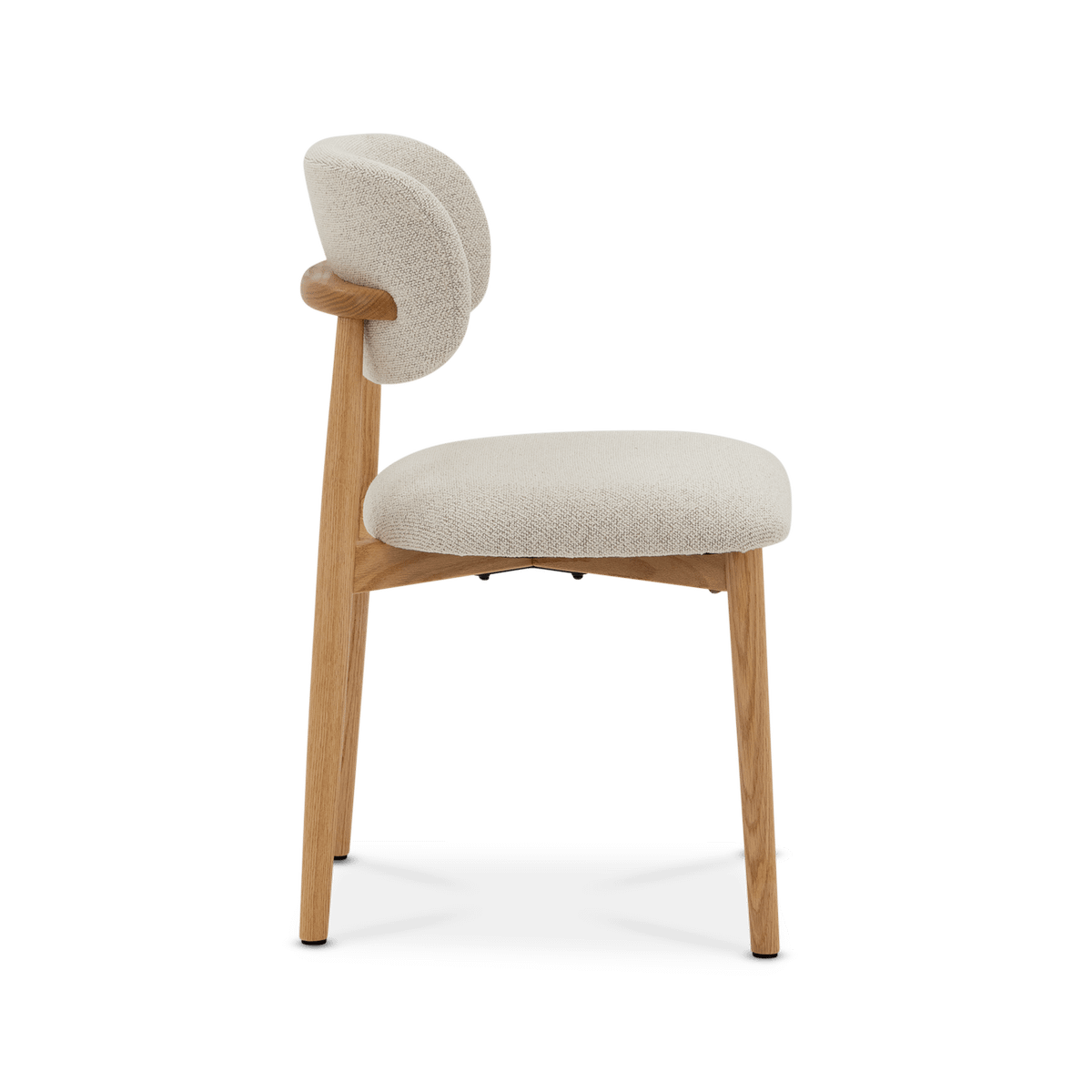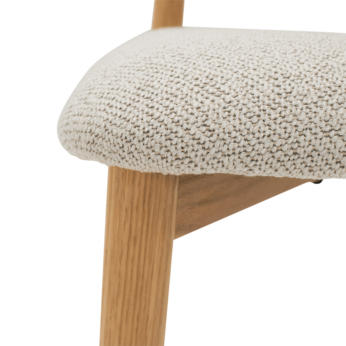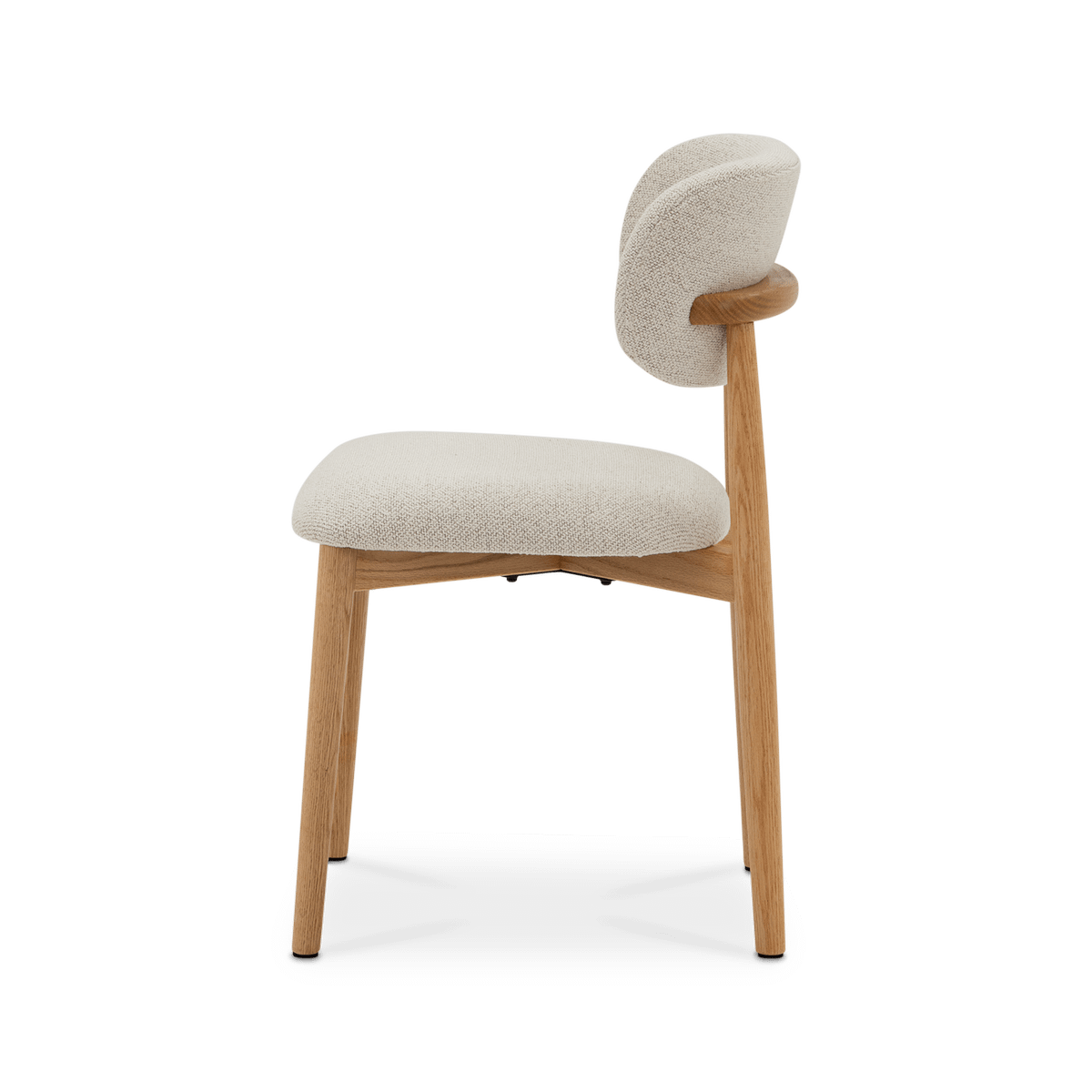 De JUNNI stoel in Monza Cream met eikenhouten poten straalt een subtiele elegantie uit die perfect past in moderne en natuurlijke interieurs.