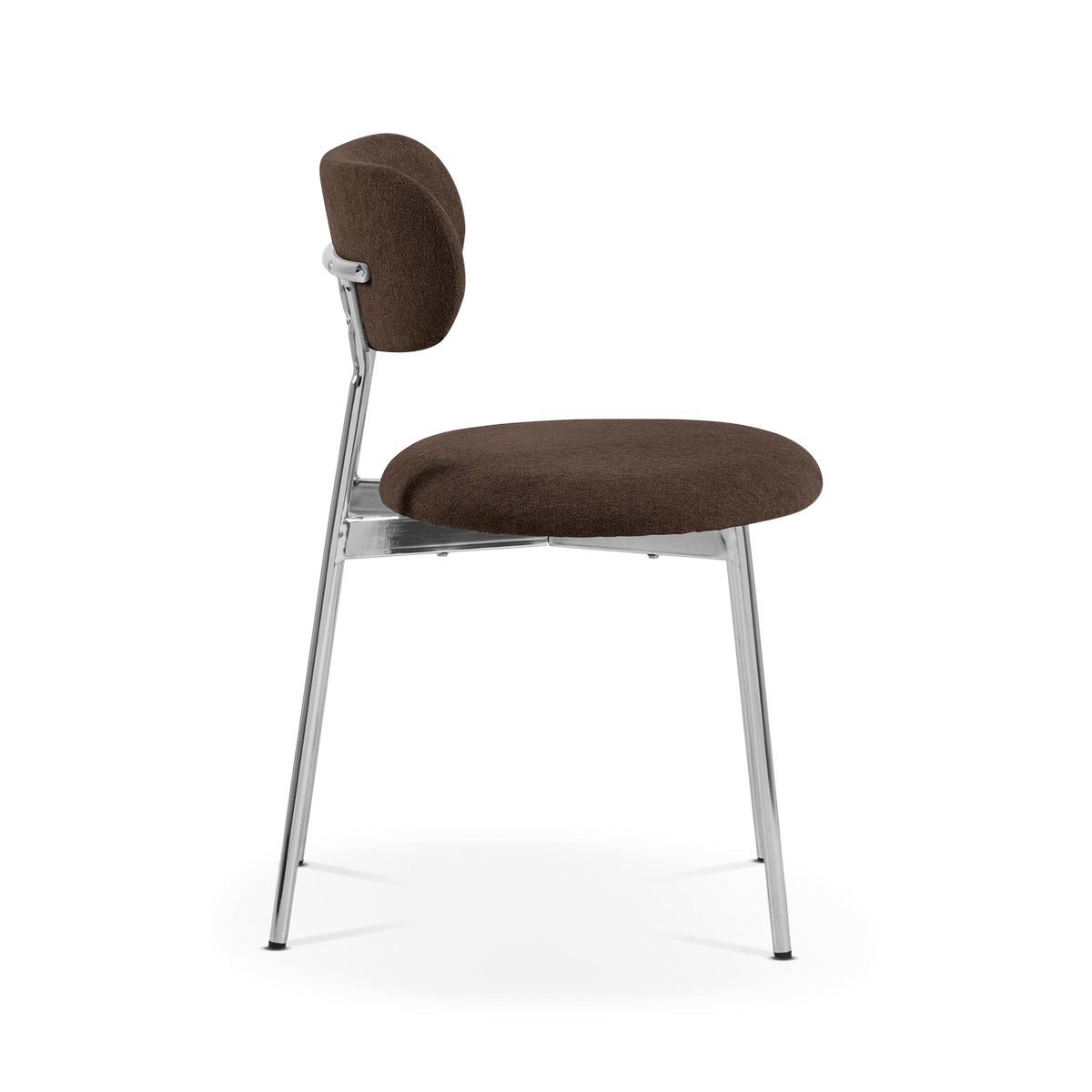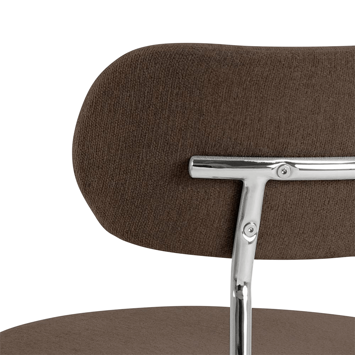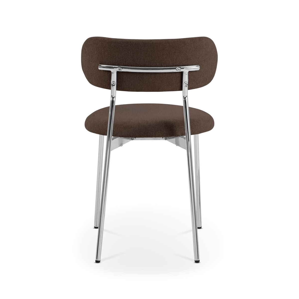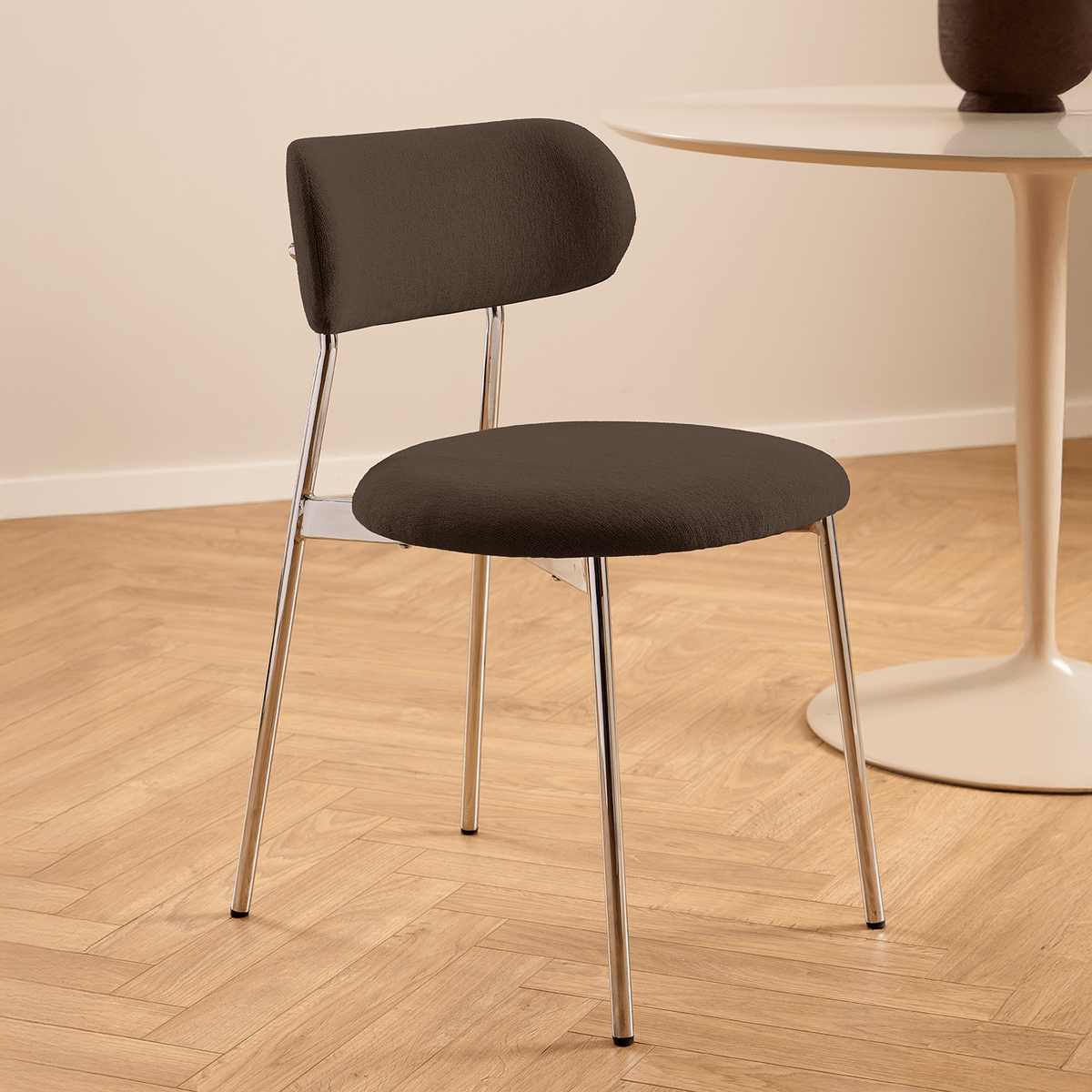 De LYKKO Stoel in Bruin combineert een warme, zachte stof met een chroomkleurig metalen frame voor een moderne, luchtige uitstraling.