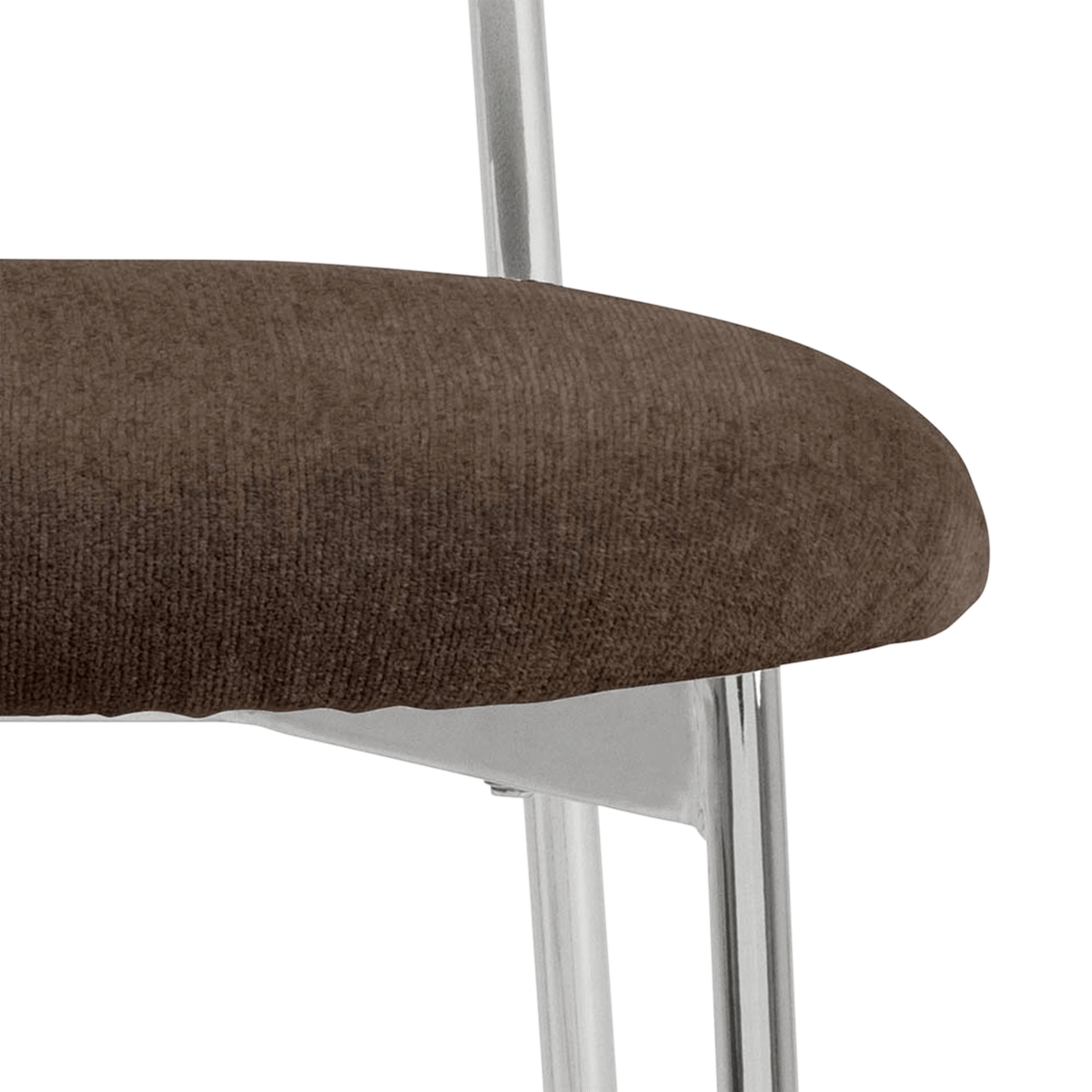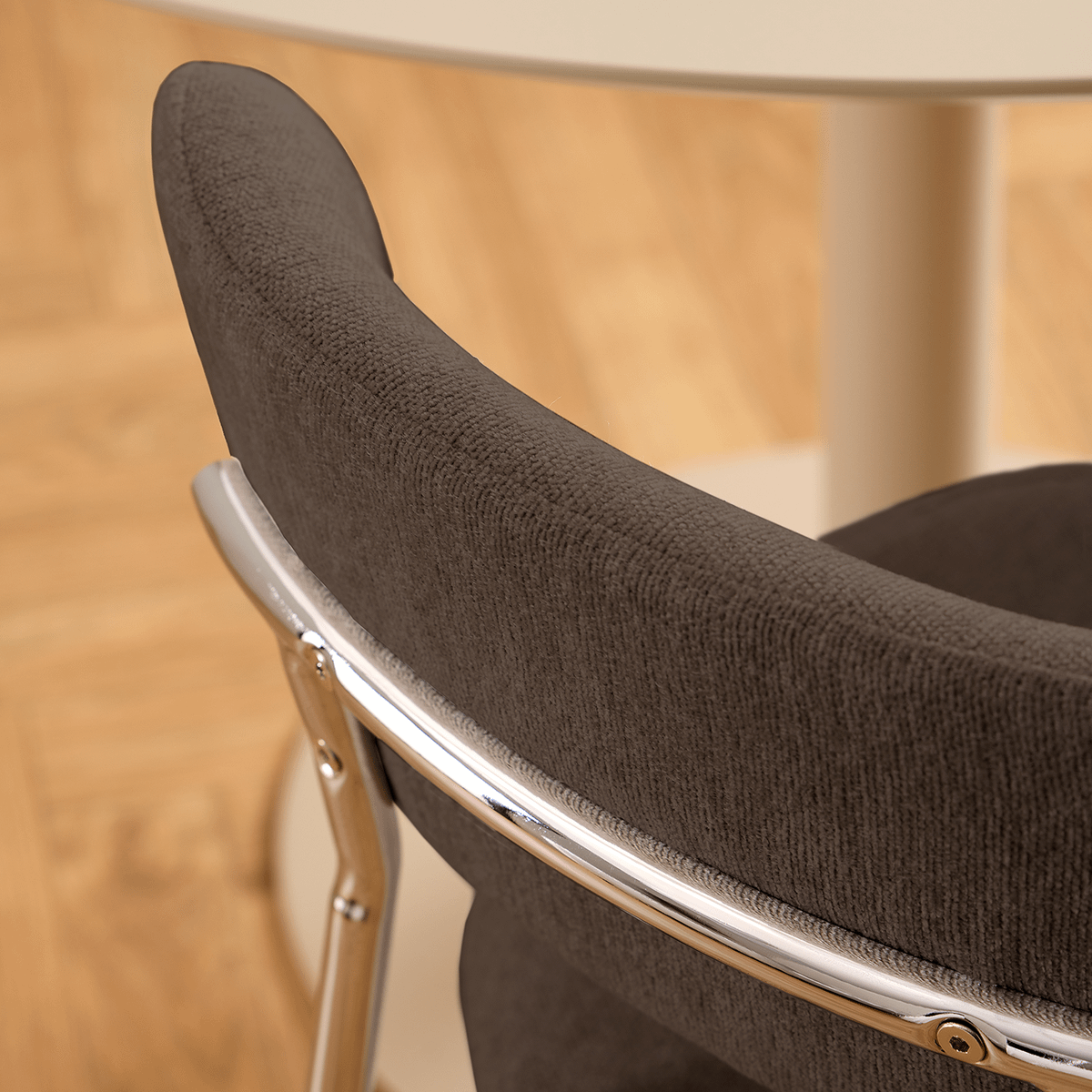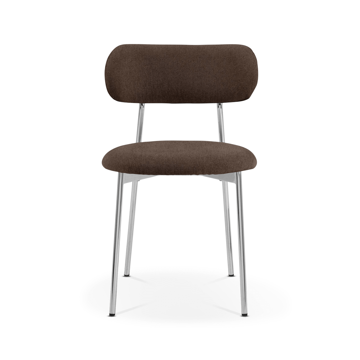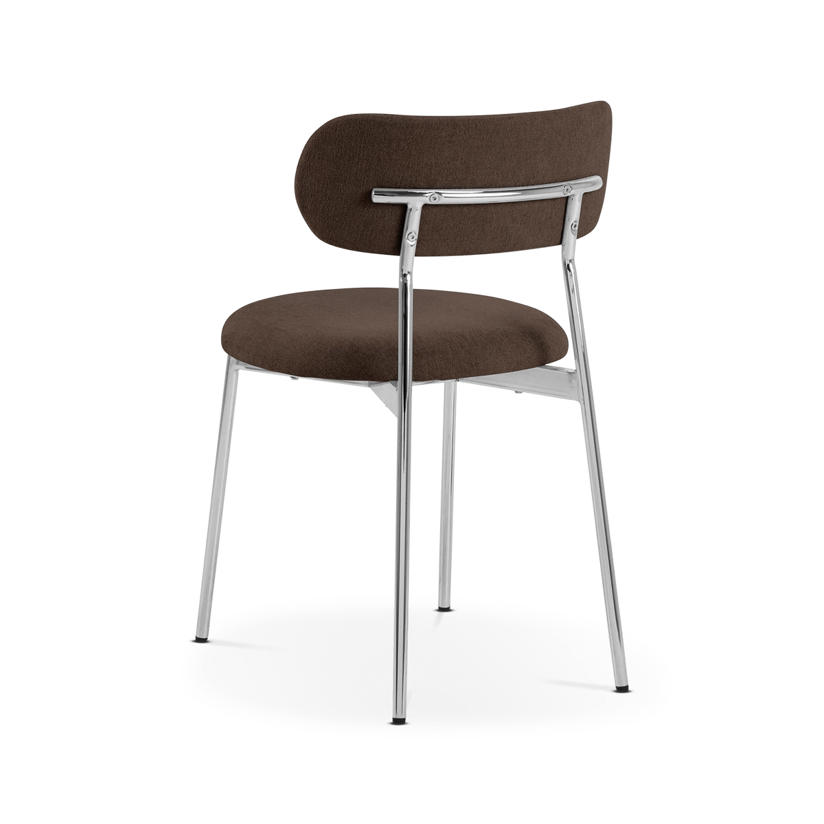 De LYKKO Stoel in Bruin combineert een warme, zachte stof met een chroomkleurig metalen frame voor een moderne, luchtige uitstraling.