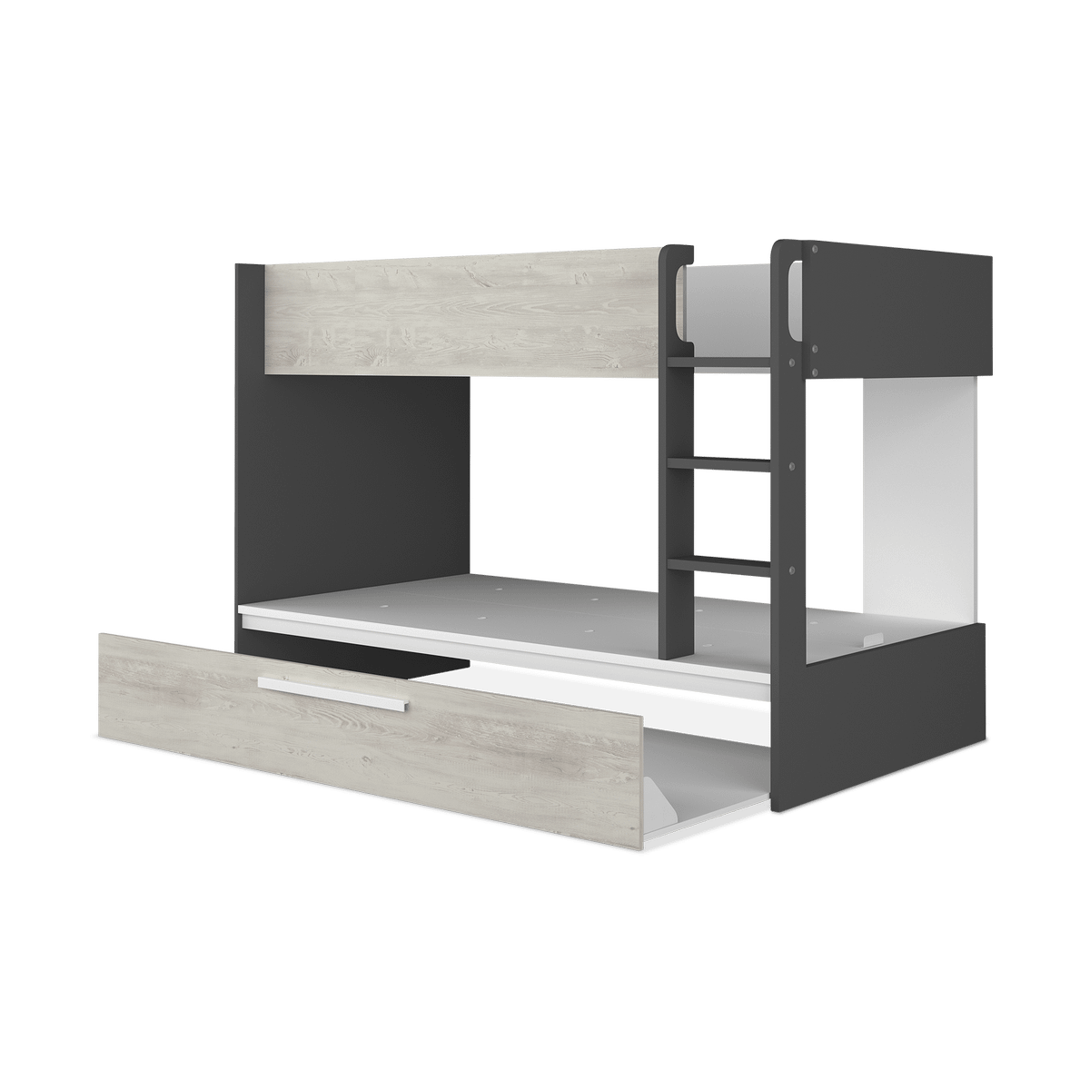 Dit stevige meubelstuk met antraciete accentkleur belooft niet alleen eindeloze avonturen en veilige nachten, maar met de slimme bedlade tover je zo een extra derde slaapplaats in je slaap- of logeerkamer. Er zijn 2 slaapplaatsen voorzien voor een matras van 90x200, in de bedlade past een matras van 90x190. Er zijn geen aparte lattenbodems vereist. En nog een voordeel: dankzij het zeer uitgekiende design, kan je het trapje zowel links als rechts monteren. En dankzij de extra anti-slipstroken op de traptredes ben je zeker van extra veilig- en stevigheid!