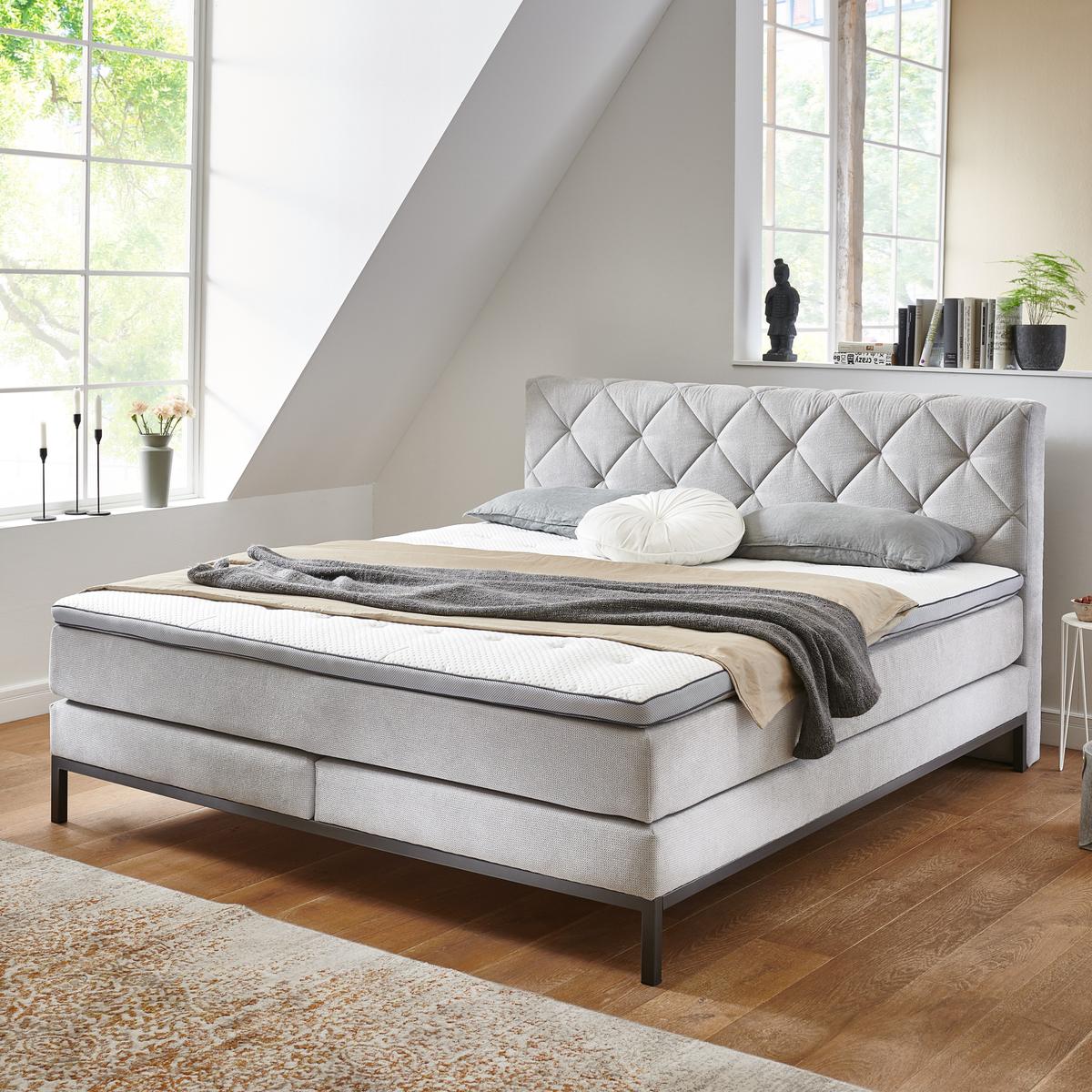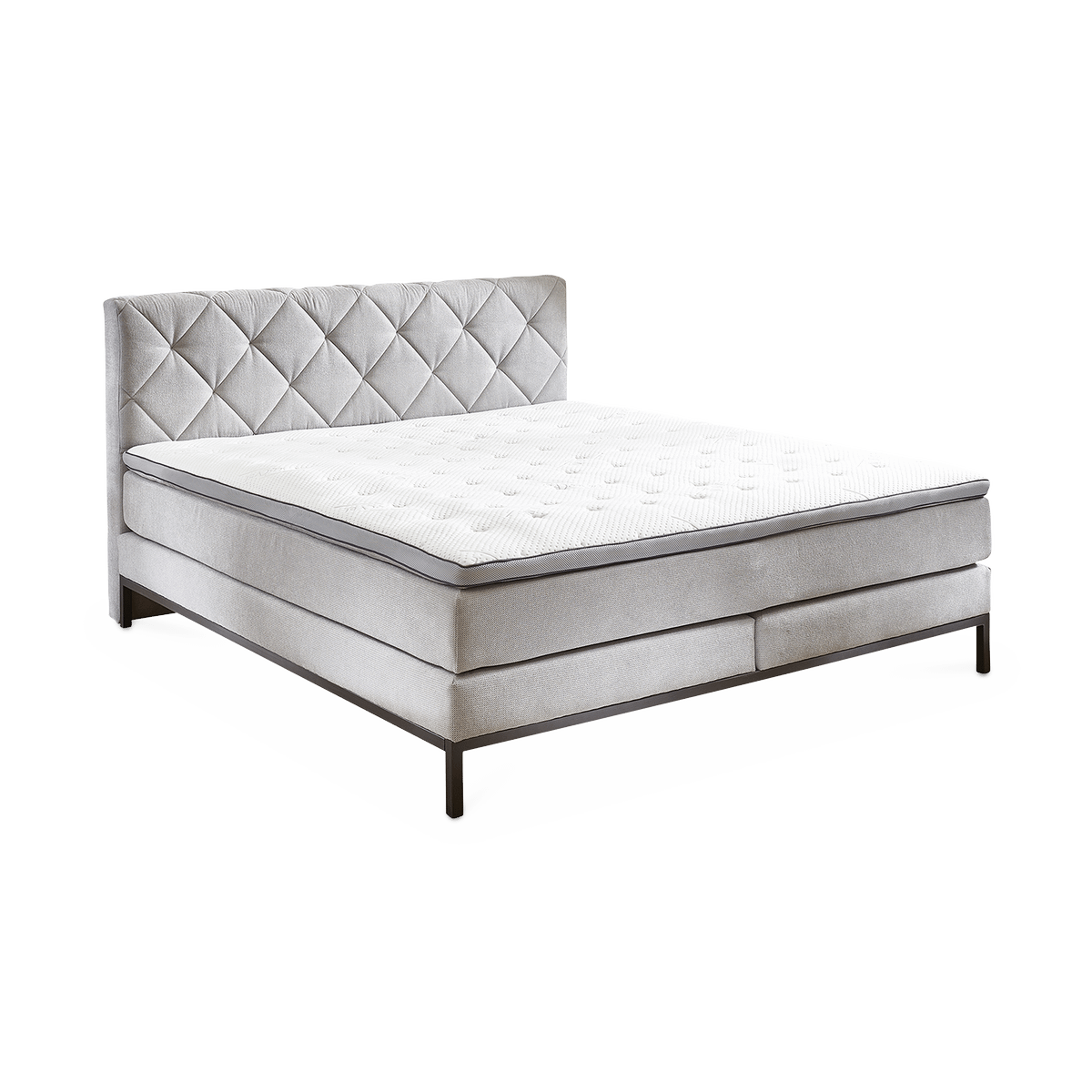 Ervaar een oase van comfort en stijl met onze boxspring MUNCHEN met afmetingen 160x200. Een meesterlijk ontworpen bed dat een vleugje luxe toevoegt aan jouw slaapkamer. De lichte, zilverkleurige stoffen bekleding nodigt uit en past moeiteloos in bijna elke inrichtingsstijl. Het ruitvormige quiltwerk op het hoofdeinde en het slanke metalen onderstel voegen een eigentijdse charme toe, waardoor het bed allesbehalve saai is.