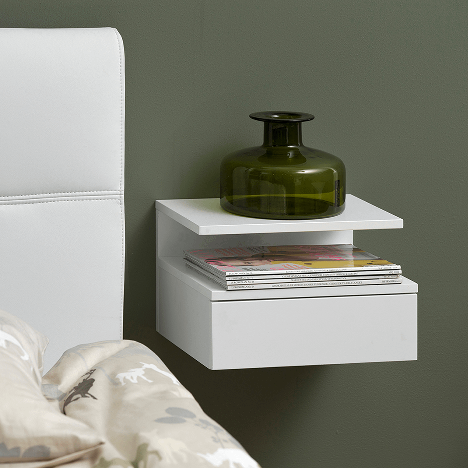 Nachttafel FREYDIS is geweldig als je niet zoveel plaats hebt in je slaapkamer! Deze nachttafel hang je makkelijk op naast je bed, en voorziet een nis voor een boek, en een extra lade voor al je rommel. Klein maar fijn dus!