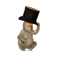 Hoedje af voor deze sympathieke tafellamp. Als een volleerde jonkheer brengt Extravaganza Gust een vleugje humor binnen in je woonkamer, slaapkamer of bureau. Op een stijlvolle manier bovendien. De kunststoffen gorilla - zeg gerust Gust - reikt met zijn linkerhand omhoog om je goedendag te knikken met zijn hoed. Niet zomaar een hoed. Binnenin de hoed zit de lamp verscholen. De open top geeft het licht vrij spel naar boven, net zoals de ruimte tussen het hoofd van de gorilla en de hoed zelf de lichtstralen naar beneden verspreidt. Zet deze extravagante verlichting aan via de schakelaar op het snoer en vlij je gezellig neer. Gorilla Gust geeft alvast het goede voorbeeld.