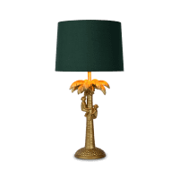 Een functionele tafellamp combineren met een speels, extravagant interieuraccent? Extravaganza Coconut doet het voor jou. Onder de klassiek ogende katoenen lampenkap speelt zich een exotisch tafereel af. Twee chimpanzees klimmen er in een palmboom. De ene plukt gretig kokosnoten terwijl de andere, kleinere aap goedkeurend toekijkt. De kruin van de boom wordt extra uitgelicht door de lamp, die haar licht difuus verspreidt. Het kunststof armatuur is een halve meter hoog en is compatibel met een ledlamp. Het licht aan en uit schakelen doe je eenvoudig met de schakelaar op het snoer. Geniet van het schouwspel en van de nieuwe blikvanger in je interieur.
