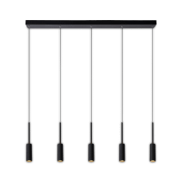 In een moderne eetkamer hoort een hedendaagse luchter. Welkom Tubule. De vijf lichtpunten zijn op een rechte lijn aan een strakke plafondplaat bevestigd. Een eenduidig en elegant ontwerp. Maak je het liever wat speelser? Varieer dan de hoogtes van de vijf lichtpunten. In de cilindervormige lampenkappen uit aluminium zijn de lichtbronnen geïntegreerd. Langs boven en onder ontsnapt sfeervol warm wit licht. Tubule is klaar voor het volgende etentje. Jij ook?
