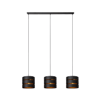 De hanglamp ROSAS 3-delig in zwart en goud combineert retro charme met moderne elegantie. Met drie pendels in een strakke lijn van 110 cm lengte is deze lamp de perfecte keuze boven een eettafel of keukeneiland. De cilindervormige kappen uit staal, afgewerkt in mat zwart met een warme gouden binnenzijde, zorgen voor een luxueus contrast en creëren een gezellige, sfeervolle gloed.