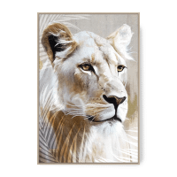 Breng de wilde schoonheid van de natuur in uw huis met wanddecoratie FARIS. Dit indrukwekkende canvas van 80x120 cm toont een prachtig handgeschilderd olieverfschilderij van een majestueuze leeuwin, omlijst door een verfijnde beige kader. De gedetailleerde penseelstreken en de levensechte weergave van de leeuwin brengen een gevoel van kracht en sereniteit in elke kamer.