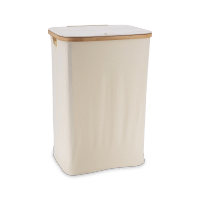 De mand is vervaardigd van beige polyester en afgewerkt met bamboe accenten, wat zorgt voor een moderne uitstraling.