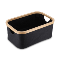 Opbergmand SOLIAM is een praktische opberger voor bad- of slaapkamer! Deze rechthoekige mand is gemaakt zwart polyester en afgewerkt met een bamboe accent, waardoor hij een moderne en natuurlijke uitstraling heeft.