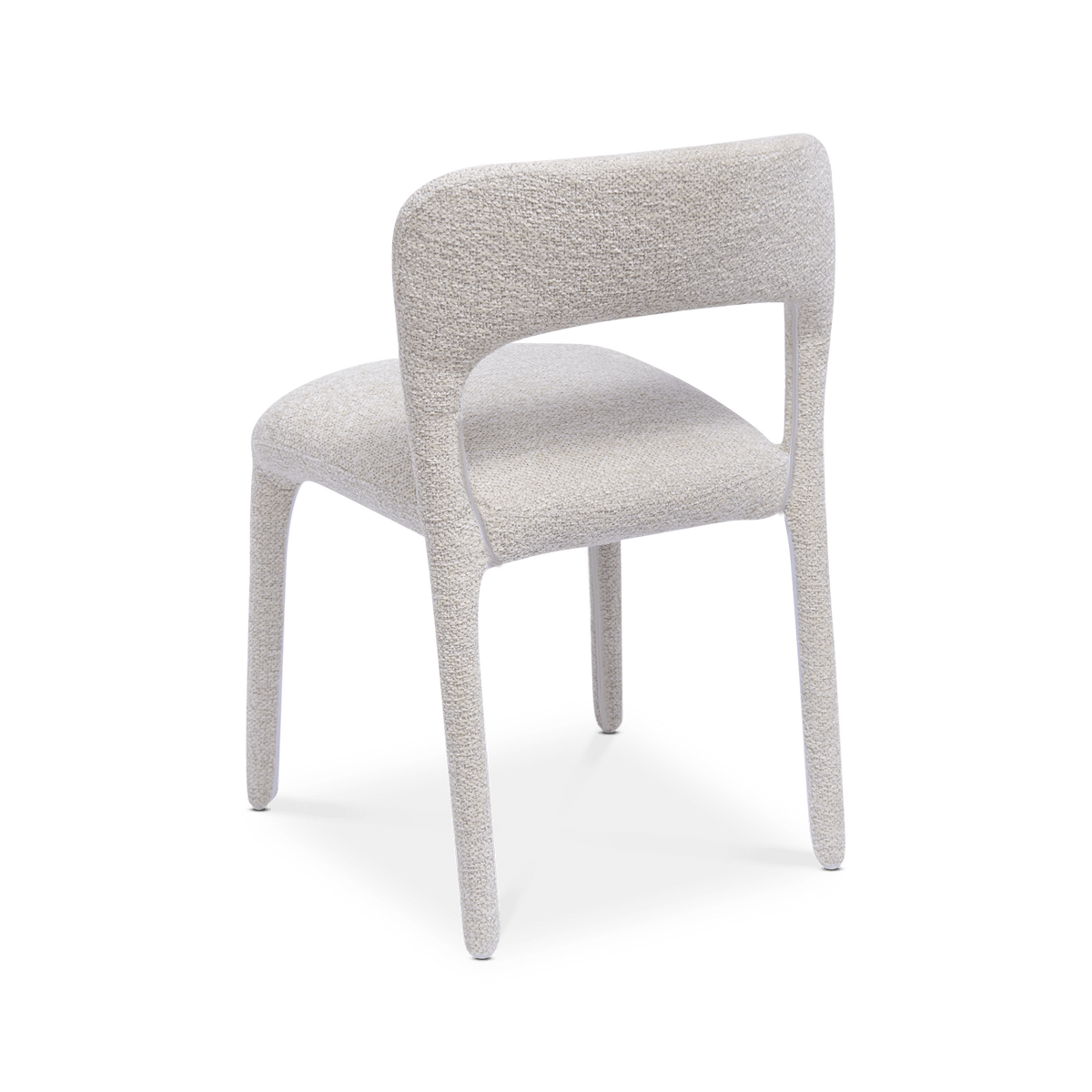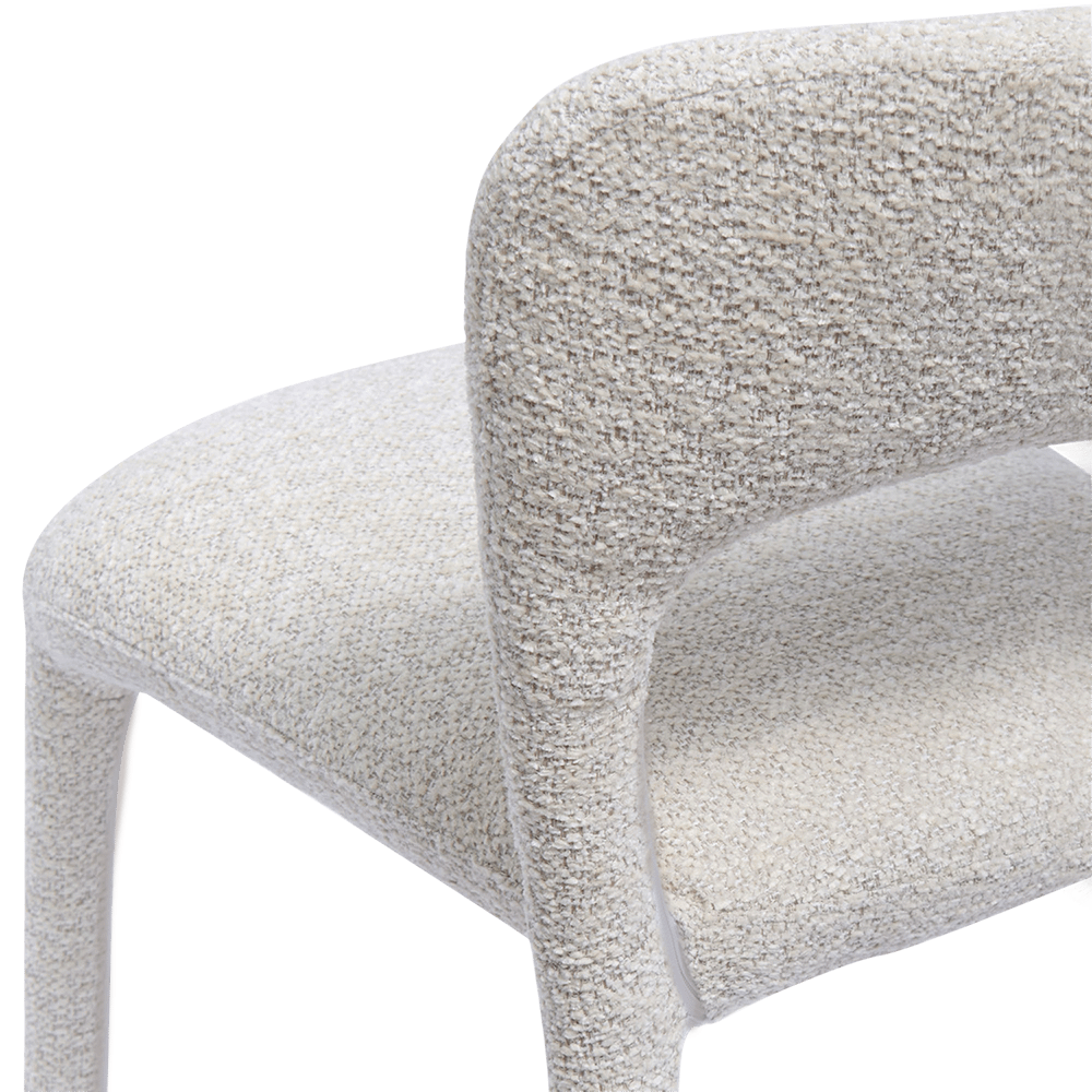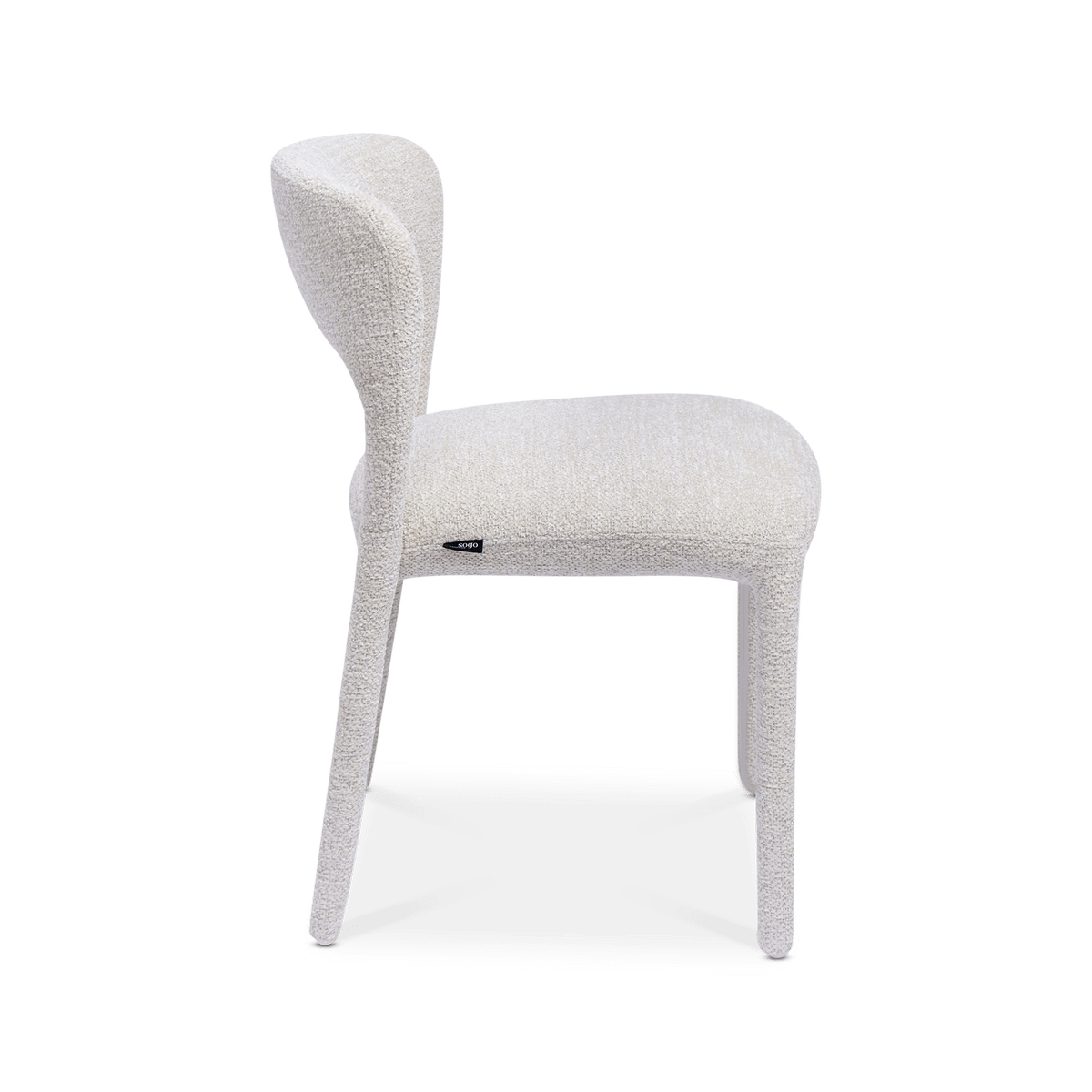 De LAURA Stoel combineert elegantie en comfort in één ontwerp. De zachte bouclé-stof in de kleur Ivory Cloud geeft de stoel een verfijnde uitstraling, terwijl de volledig gestoffeerde poten zorgen voor een uniform en luxueus geheel.