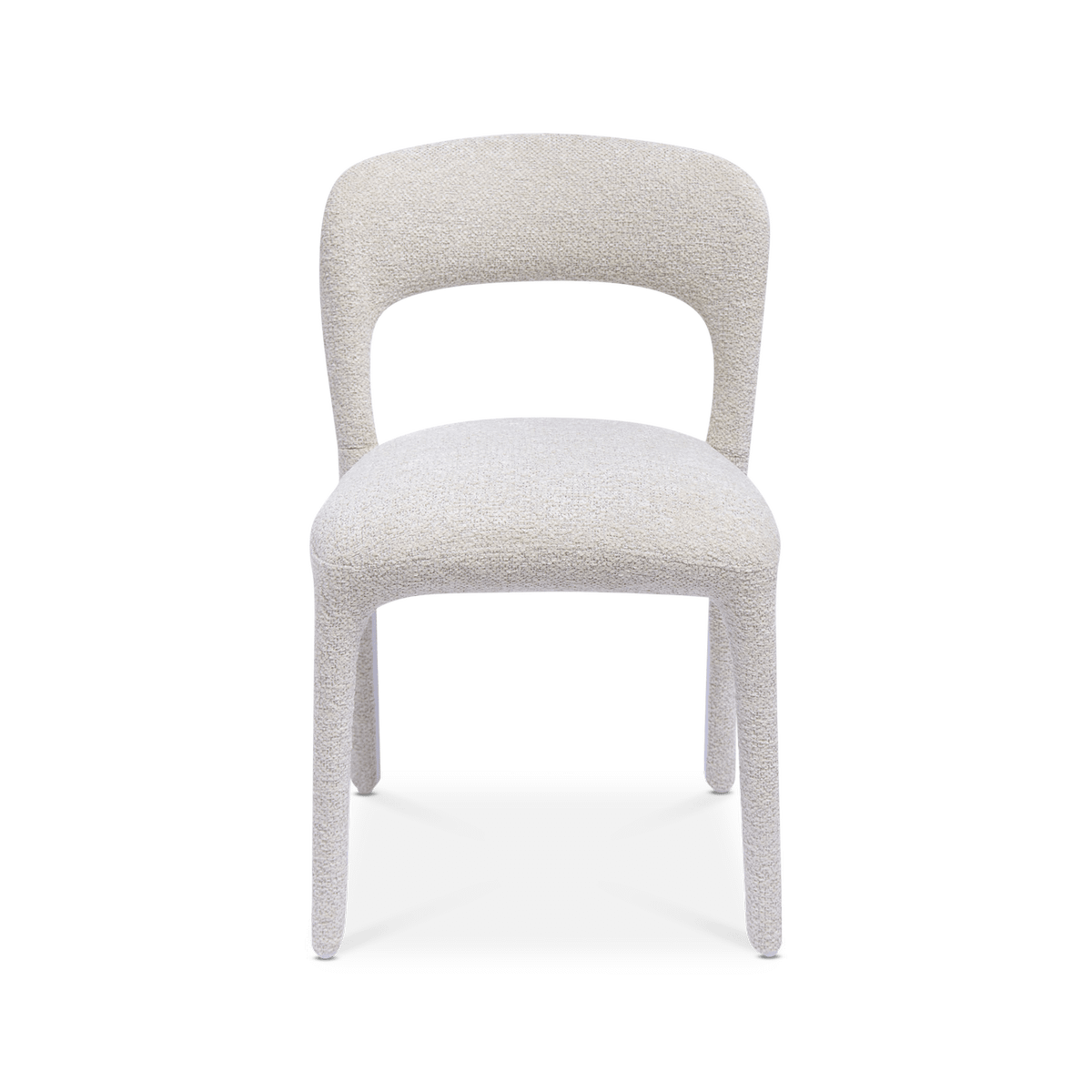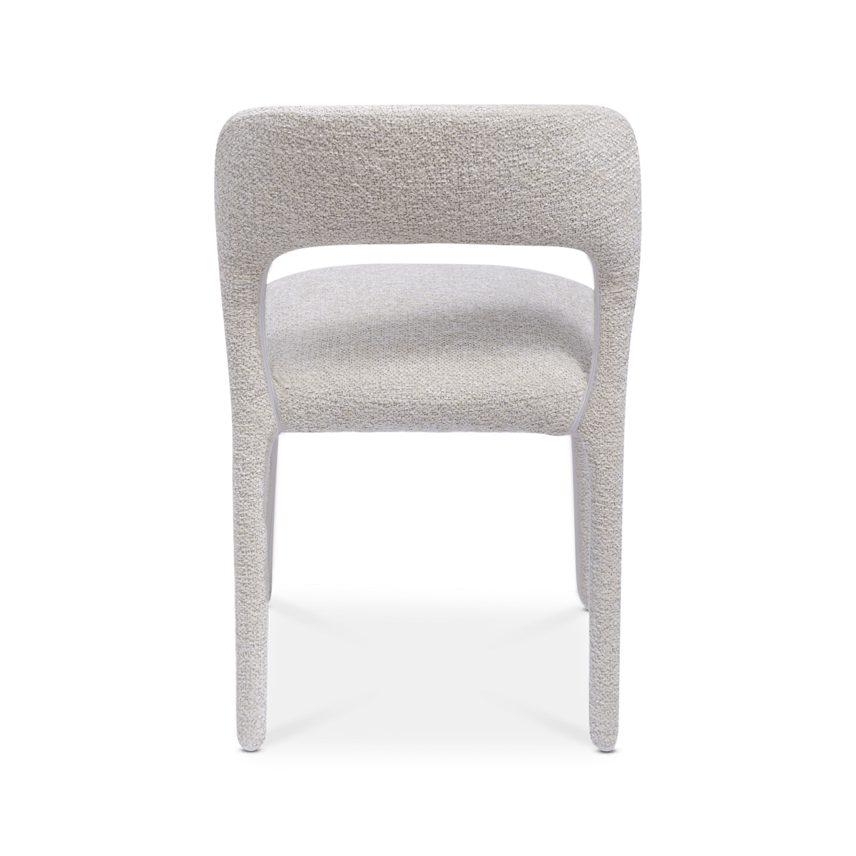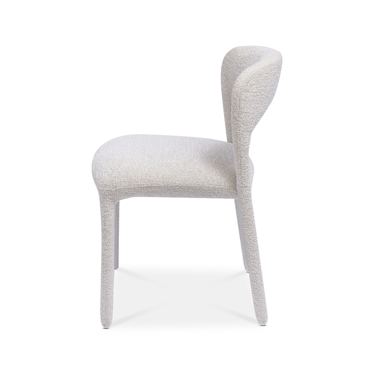 De LAURA Stoel combineert elegantie en comfort in één ontwerp. De zachte bouclé-stof in de kleur Ivory Cloud geeft de stoel een verfijnde uitstraling, terwijl de volledig gestoffeerde poten zorgen voor een uniform en luxueus geheel.