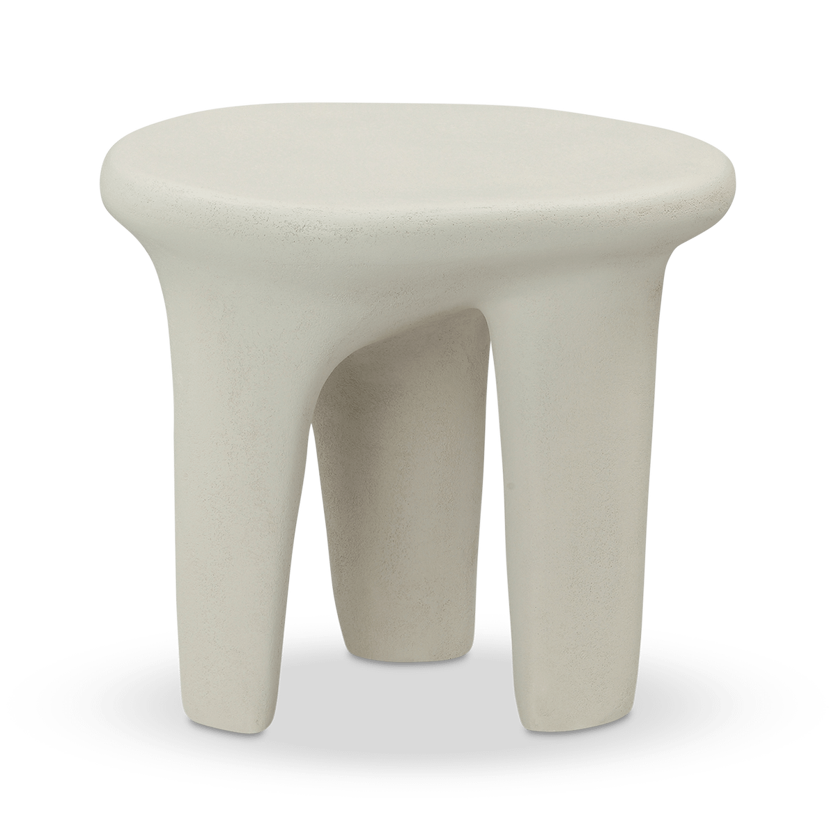 De drie afgeronde poten creëren een speelse maar stabiele basis, terwijl het zachte, afgeronde blad uitnodigt tot gebruik als bijzettafel of decoratief accent.