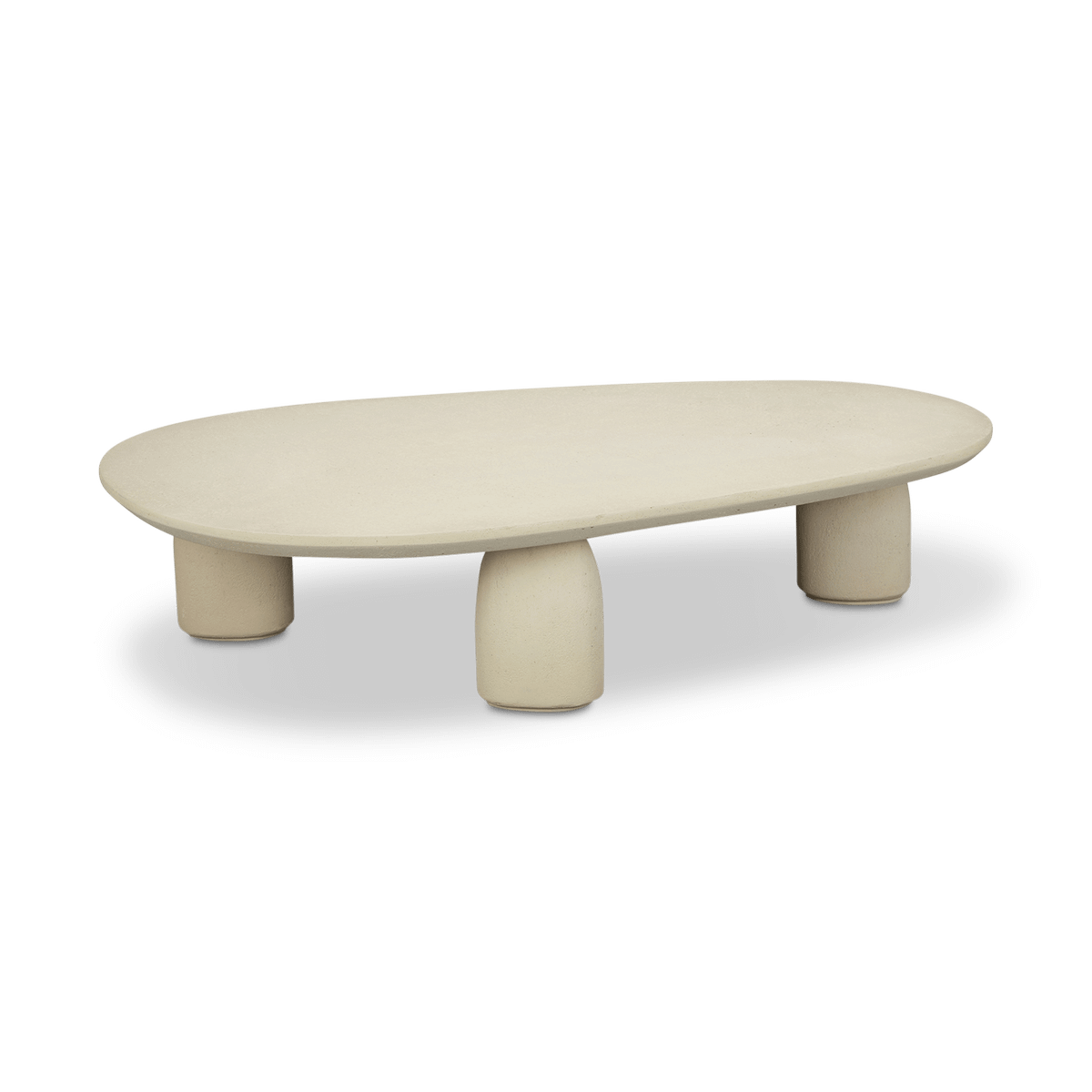 De drie afgeronde poten zorgen voor een harmonieuze en sculpturale uitstraling, terwijl het ruime blad voldoende plaats biedt voor decoratie of koffieservies.