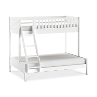 Stapelbed CHARLOTTE biedt een slimme en stijlvolle slaapoplossing met een praktische 90x200 bovenbed en een ruim 140x200 onderbed. Ideaal voor gezinnen, logeerpartijen of compacte slaapkamers. Dankzij het stevige houten frame en de tijdloze witte afwerking straalt dit bed rust en kwaliteit uit. De schuine ladder zorgt voor een veilige en gemakkelijke toegang tot de bovenste slaapplaats, terwijl de verhoogde randen extra bescherming bieden. Een ruimtebesparende én gezellige oplossing voor elk interieur!