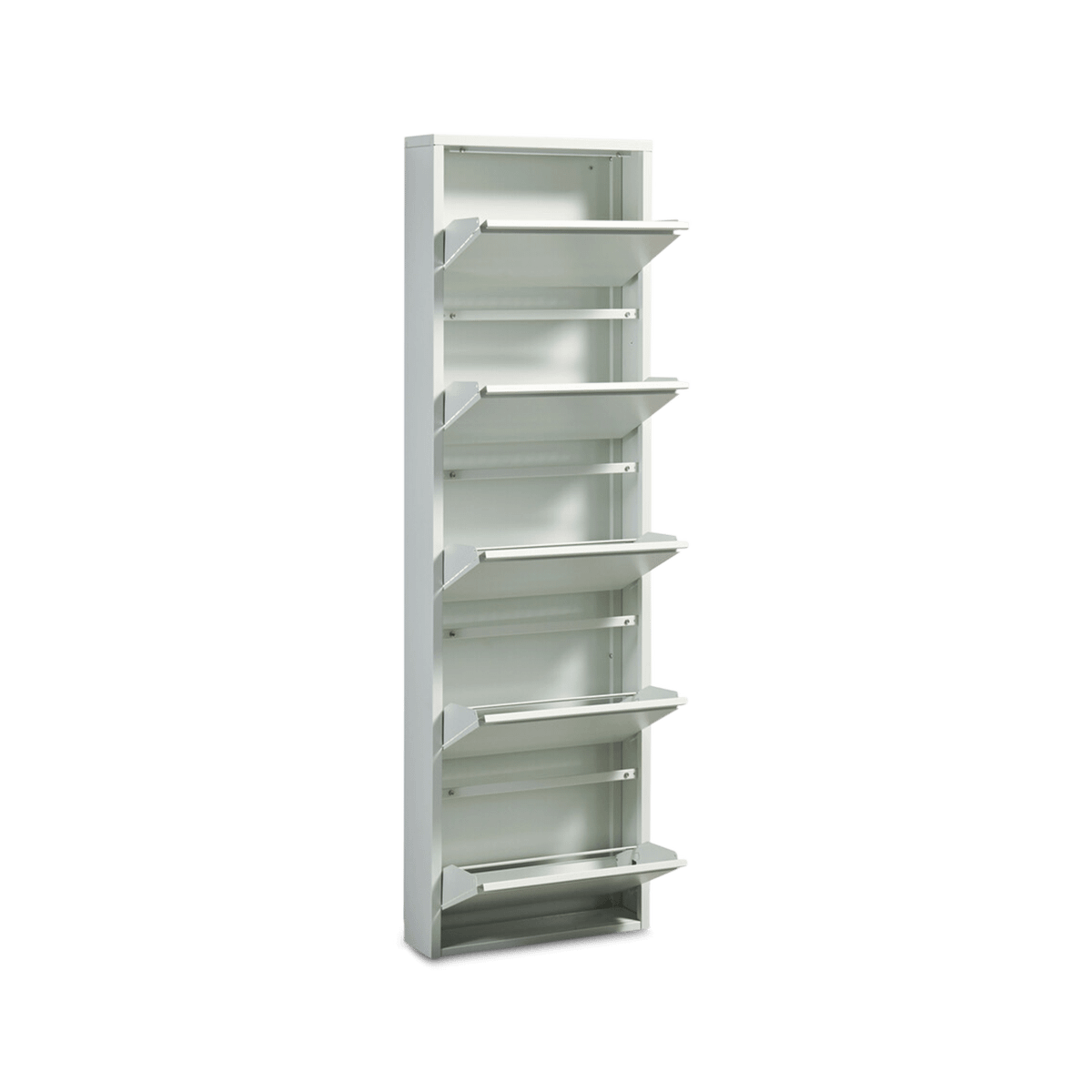 Schoenenkast GITTE in Wit combineert een strak design met maximale functionaliteit en is de perfecte oplossing voor een georganiseerde hal of slaapkamer. Dankzij de smalle en hoge vormgeving neemt deze schoenenkast weinig plaats in, terwijl je toch verrassend veel schoenen netjes kunt opbergen achter de vier kleppen. De witte afwerking zorgt voor een tijdloze, moderne uitstraling die past in zowel een minimalistisch als een klassiek interieur. Bovendien houdt de gesloten opbergstructuur je schoenen stofvrij en creëer je meteen een opgeruimde en stijlvolle indruk bij binnenkomst. Ideaal voor wie praktisch wonen wil combineren met een frisse, elegante look.