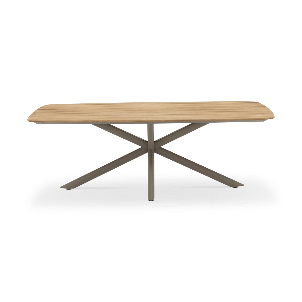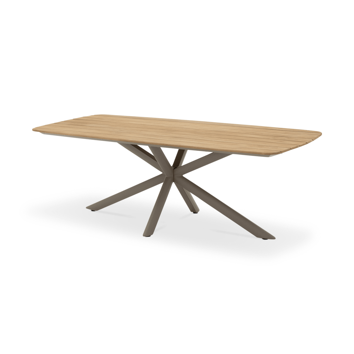 Het teak tafelblad geeft de tafel een authentieke en stijlvolle uitstraling, terwijl het mocha taupe onderstel met zijn opvallende stervormige poten zorgt voor een eigentijds en luchtig design. Met zijn royale afmeting van 220x100 cm biedt deze tafel ruim plaats om samen te genieten van lange diners en gezellige momenten buiten. Dankzij de duurzame materialen en het tijdloze ontwerp vormt tuintafel Capri een elegante blikvanger op elk terras.