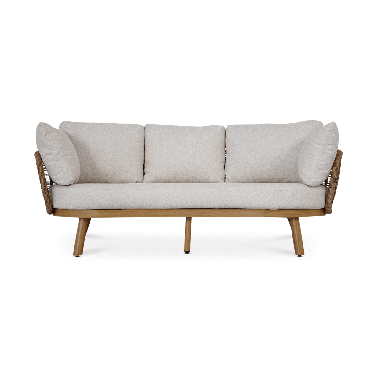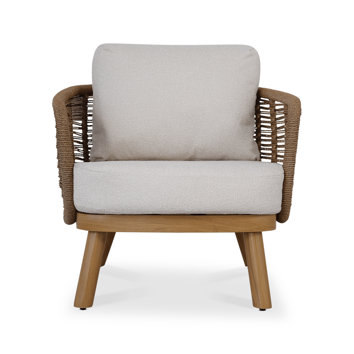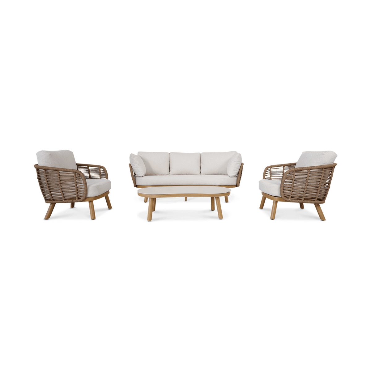 Loungeset Ventura uit onze Premium Outdoor Collectie straalt een warme en natuurlijke sfeer uit dankzij de combinatie van een coffee kleurige wickerstructuur en houtlook poten. De zachte, lichte kussens zorgen voor een aangenaam zitcomfort en geven het geheel een uitnodigende uitstraling. De ronde vormen en het verfijnde vlechtwerk maken deze set tot een stijlvolle blikvanger op elk terras. Met de comfortabele sofa, twee fauteuils en een bijpassende salontafel biedt Ventura de perfecte plek om ontspannen te genieten van lange zomeravonden in een gezellige en elegante buitenomgeving.